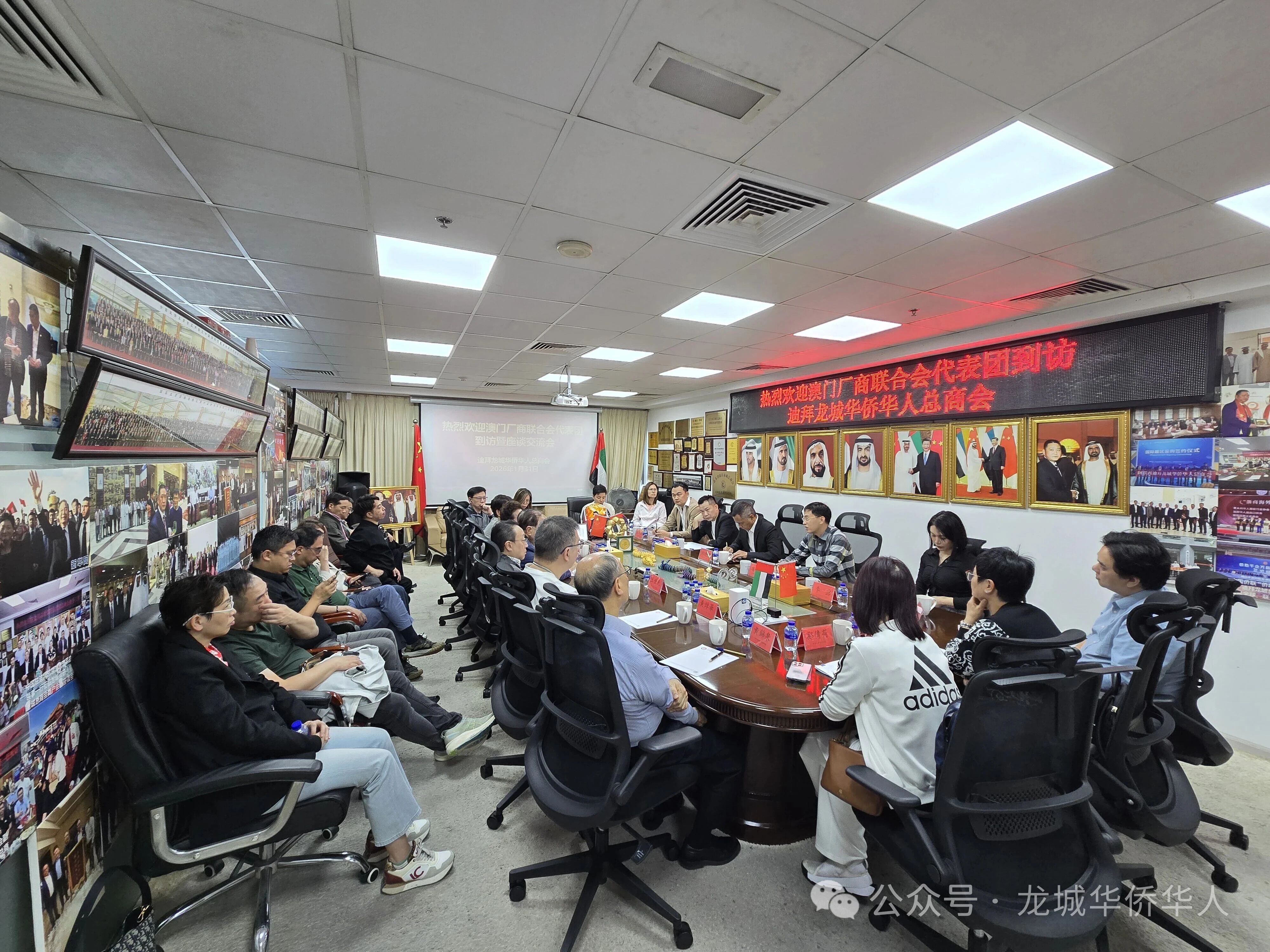 1月31日,澳門廠商聯(lián)合會(huì)會(huì)長(zhǎng)崔煜林率領(lǐng)二十余位會(huì)員企業(yè)代表到訪迪拜龍城總商會(huì),開展考察交流活動(dòng),深入了解迪拜及中東市場(chǎng)發(fā)展環(huán)境,為澳門企業(yè)拓展海外業(yè)務(wù)、布局中東市場(chǎng)尋求新機(jī)遇。在迪拜龍城總商會(huì)會(huì)長(zhǎng)金國(guó)中的委托下,商會(huì)常務(wù)副會(huì)長(zhǎng)鄭迪祥、丘勝祥,副會(huì)長(zhǎng)金曉波、李露,顧問(wèn)項(xiàng)敬儒等對(duì)代表團(tuán)一行進(jìn)行了熱情接待,并舉行座談交流。