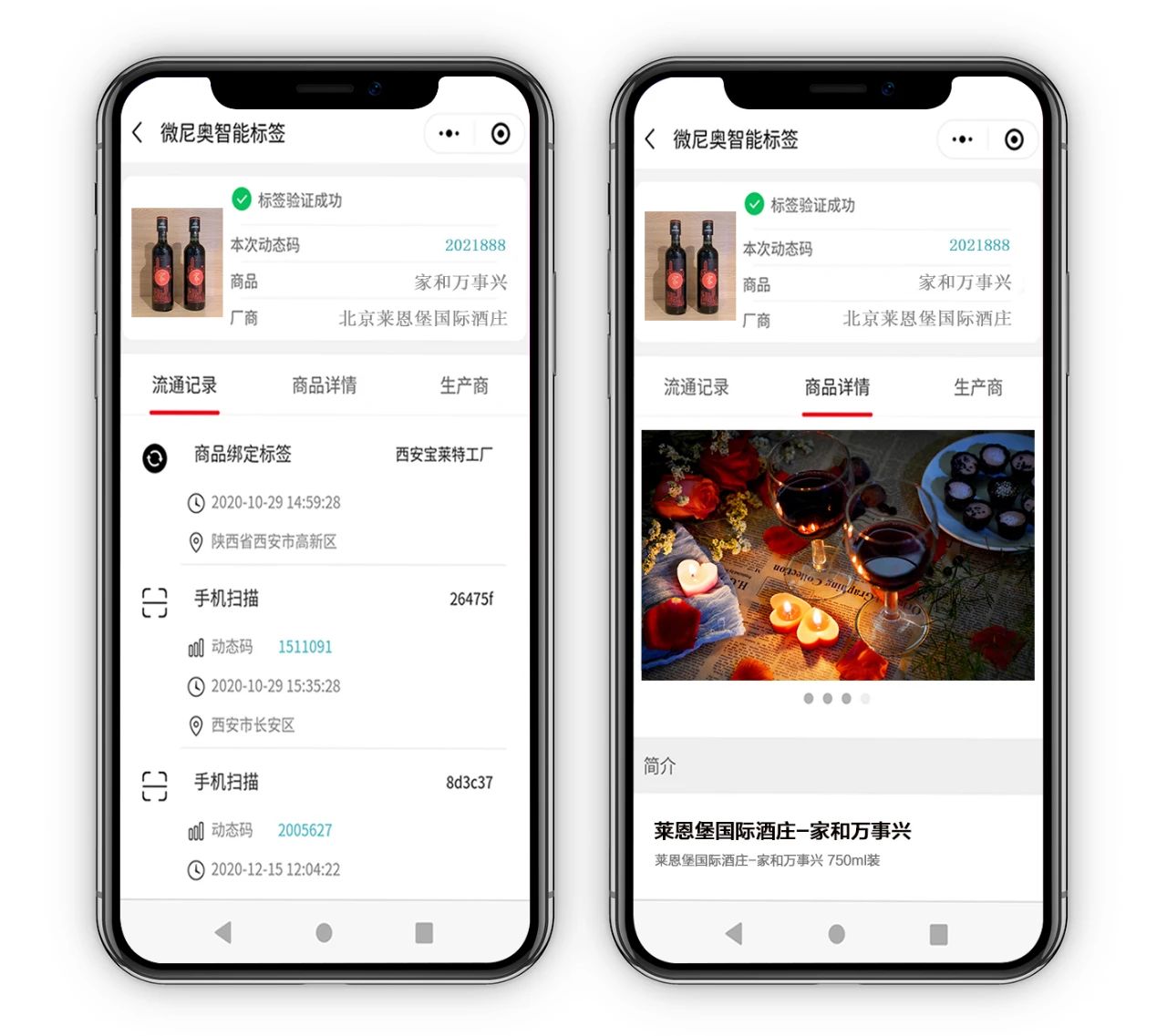 “微尼奧標簽”采用的動態(tài)變碼防偽技術,能夠?qū)崿F(xiàn)一物一動態(tài)碼,即每個產(chǎn)品都有一個獨有的“防偽身份證”。消費者通過手機掃碼,實時查詢商品信息,能夠有效鑒真。