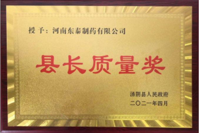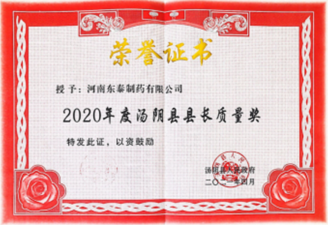 在本次會(huì)議上,河南東泰制藥有限公司被授予2020年度湯陰縣“縣長質(zhì)量獎(jiǎng)”光榮稱號(hào),這是東泰在質(zhì)量管理方面獲得的一重要榮譽(yù),是對(duì)公司長期以來推行卓越質(zhì)量管理所得成績的充分肯定。