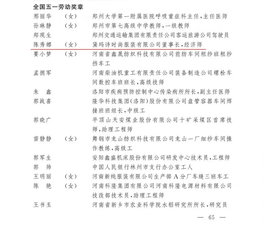 陳秀娜同志除獲得“全國五一勞動(dòng)獎(jiǎng)?wù)?rdquo;外,還先后榮獲“全國三八紅旗手”、“全國巾幗建功標(biāo)兵”、“河南省勞動(dòng)模范”、“河南省三八紅旗手”等榮譽(yù)稱號(hào),現(xiàn)任黛瑪詩時(shí)尚服裝有限公司董事長、河南省第十三屆人大代表、河南僑商聯(lián)合會(huì)副會(huì)長、河南省服裝協(xié)會(huì)常務(wù)會(huì)長。
