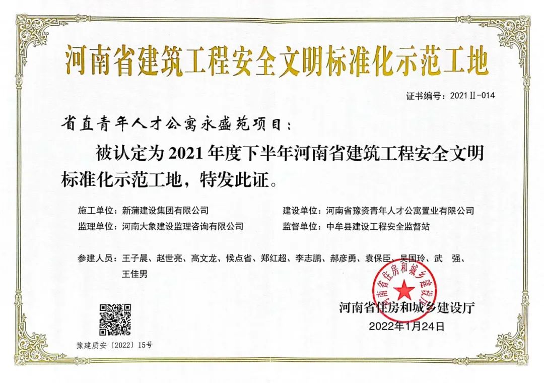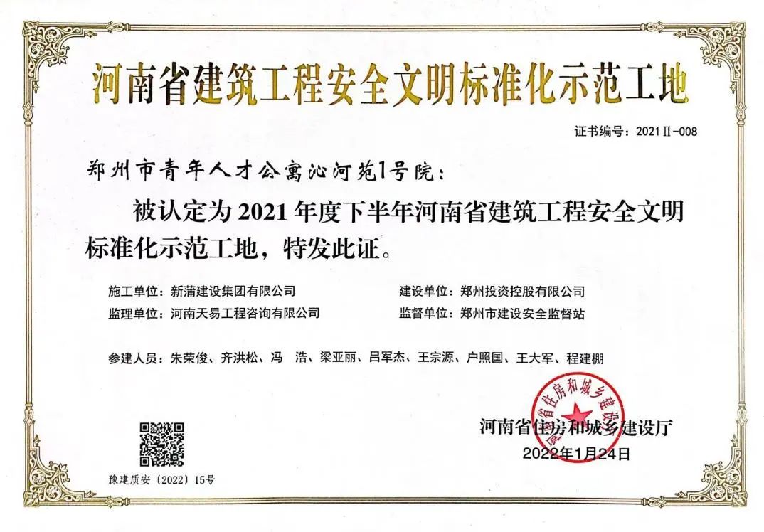近日,由河南省住房和城鄉(xiāng)建設廳組織評審的2021年度下半年河南省建筑工程安全文明標準化示范工地結果公布,新蒲建設集團有限公司建設的省直青年人才公寓永盛苑項目、鄭州市青年人才公寓沁河苑1號樓項目獲得了“河南省建筑工程安全文明標準化示范工地”的榮譽稱號。