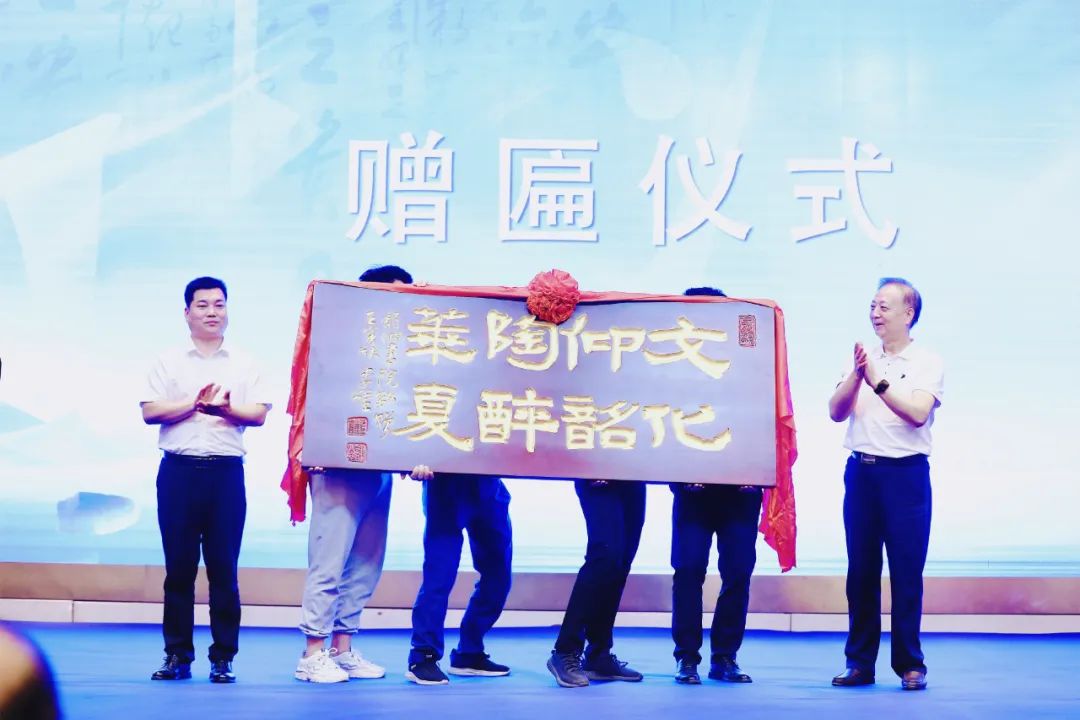 緊接著是贈(zèng)匾環(huán)節(jié)。龍湖書院夏林院長代表龍湖書院向仰韶酒業(yè)黨委副書記、河南仰韶營銷有限公司總經(jīng)理郝惠鋒贈(zèng)送由河南省書法院院長、第四屆河南省書法家協(xié)會(huì)副主席、龍湖書院導(dǎo)師李強(qiáng)先生為仰韶酒業(yè)題寫的匾額——文化仰韶,陶醉華夏。筆力遒勁妍美、高古大氣,給全場造成了強(qiáng)烈的震撼。