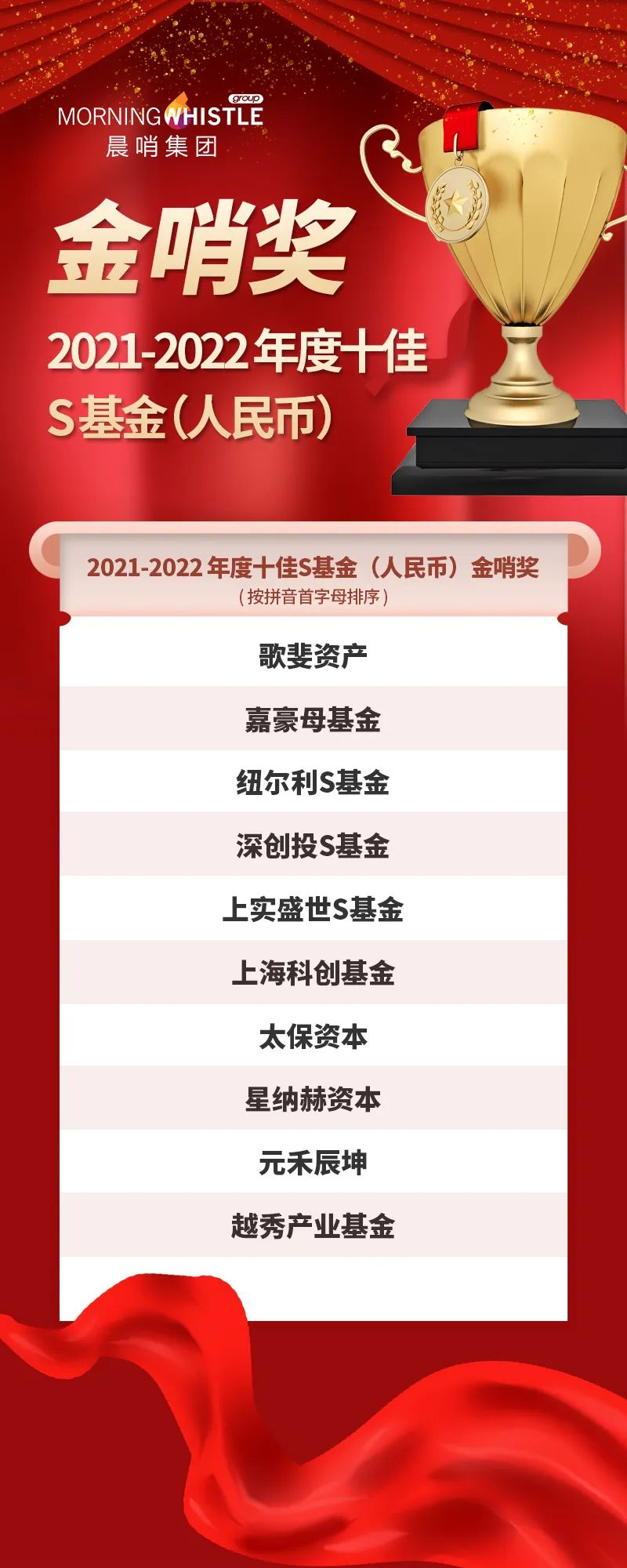 2021-2022 年度十佳S基金(人民幣)金哨獎(jiǎng) 頒發(fā)給S基金市場(chǎng)的奠基者和引領(lǐng)者,獲獎(jiǎng)單位無(wú)論在交易規(guī)模、交易數(shù)量和交易案例上都對(duì)市場(chǎng)極具參考價(jià)值。