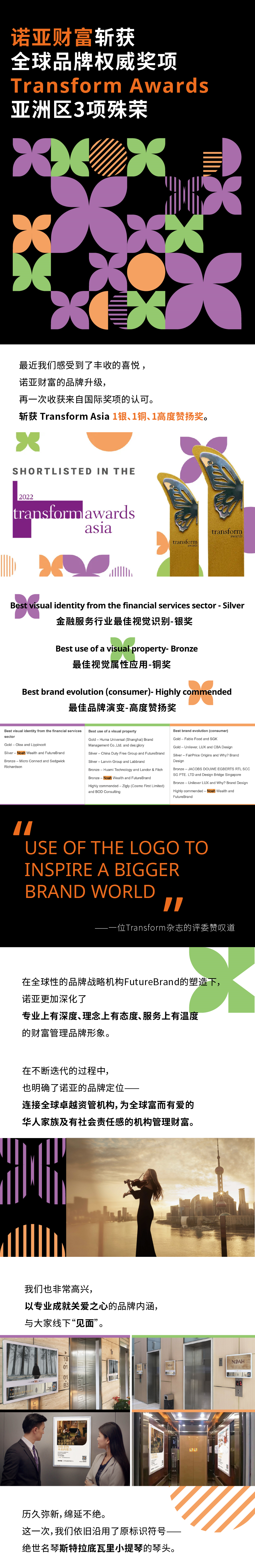 近日,省僑商會(huì)副會(huì)長(zhǎng)單位諾亞財(cái)富品牌升級(jí),再一次收獲來(lái)自國(guó)際獎(jiǎng)項(xiàng)的認(rèn)可,斬獲Transform Asia 1銀、1銅、1高度贊揚(yáng)獎(jiǎng):