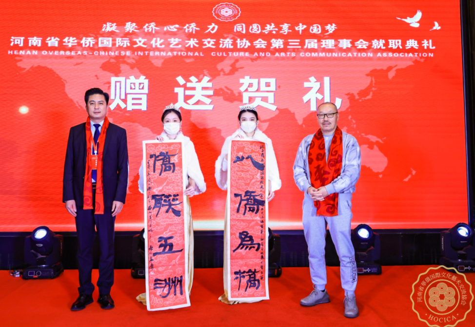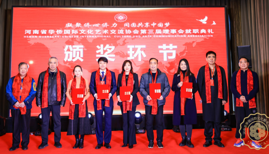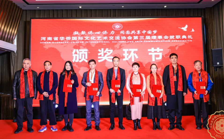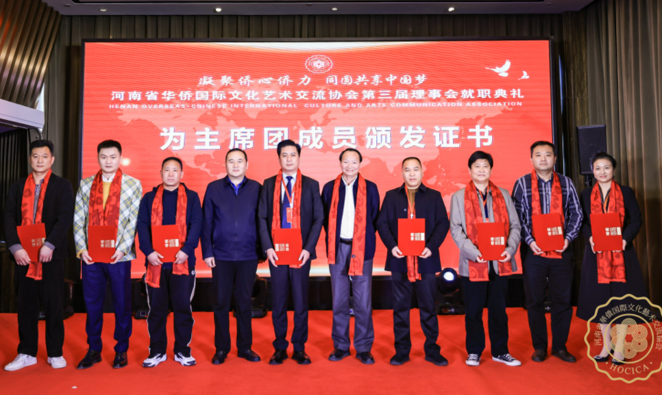 在就職典禮儀式上,協(xié)會(huì)副主席、中共省委宣傳部原二級巡視員鄭延保宣讀海內(nèi)外賀信賀電。新當(dāng)選的第三屆理事會(huì)領(lǐng)導(dǎo)班子代表集體上臺與大家見面,河南省僑聯(lián)二級巡視員劉合生、河南省民政廳社會(huì)組織管理局副局長張新志分別為新一屆主席團(tuán)成員頒發(fā)榮譽(yù)證書。