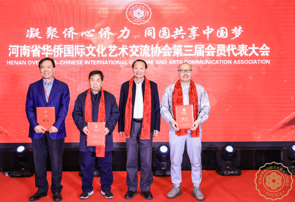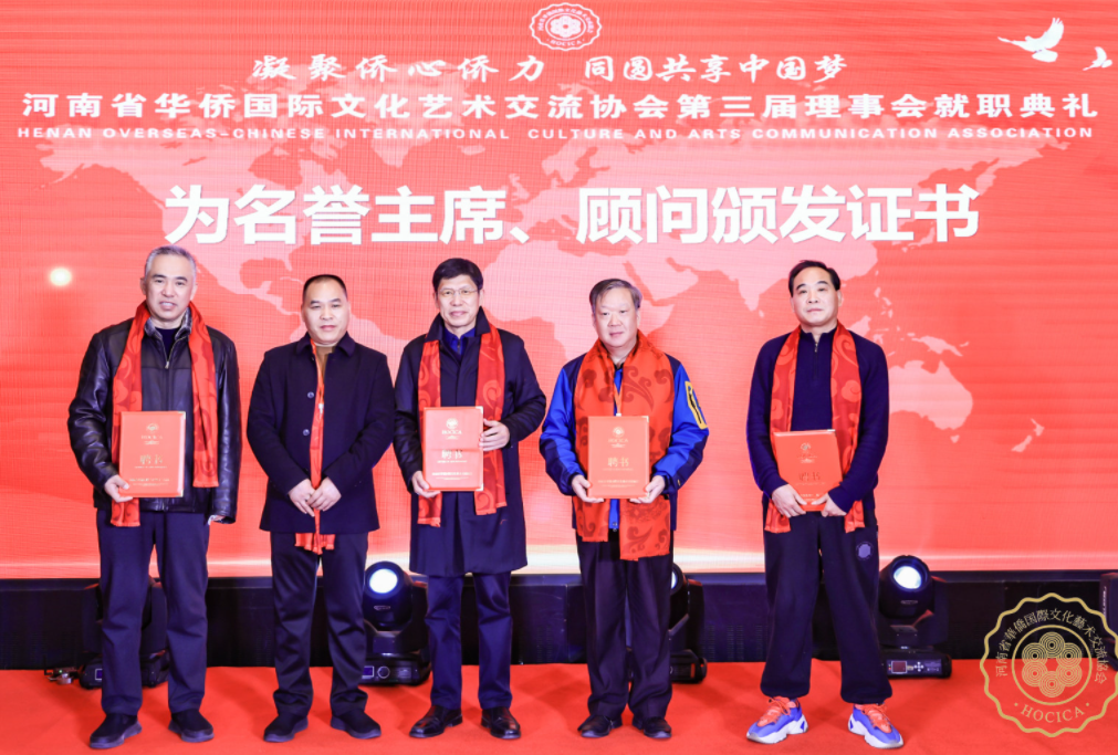 @河南省華僑國際文化藝術(shù)交流協(xié)會(huì)第三屆理事會(huì)執(zhí)行主席沈釗昌為顧問代表劉東曉(左一)、張寶松(右一)、唐衛(wèi)平(左三)、周曉剛(右二)頒發(fā)聘書