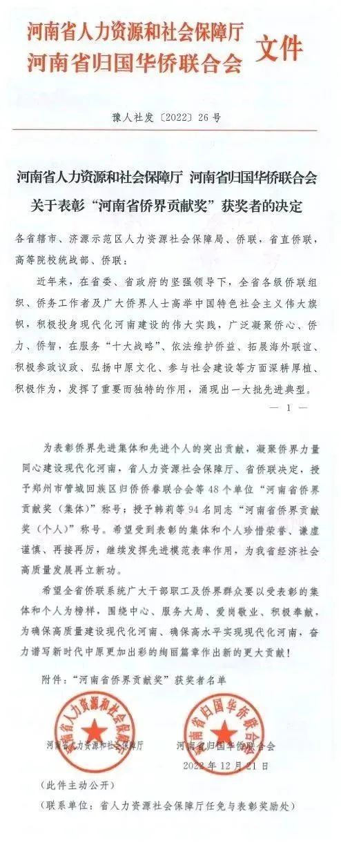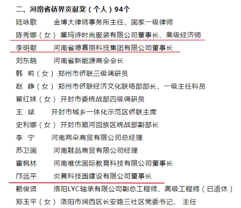 近日,河南省人社廳、河南省僑聯(lián)對(duì)“河南省僑界貢獻(xiàn)獎(jiǎng)”先進(jìn)集體和個(gè)人擬表彰名單進(jìn)行公示,我會(huì)常務(wù)副會(huì)長(zhǎng)單位河南僑創(chuàng)生命科技有限公司、團(tuán)體會(huì)員洛陽市僑商聯(lián)合會(huì)及其執(zhí)行會(huì)長(zhǎng)單位洛陽國(guó)家大學(xué)科技園喜獲“河南省僑界貢獻(xiàn)獎(jiǎng)”先進(jìn)集體榮譽(yù);我會(huì)副會(huì)長(zhǎng)陳秀娜、李明獻(xiàn),我會(huì)團(tuán)體會(huì)員洛陽市僑商聯(lián)合會(huì)會(huì)長(zhǎng)鄺遠(yuǎn)平喜獲“河南省僑界貢獻(xiàn)獎(jiǎng)”先進(jìn)個(gè)人榮譽(yù)。