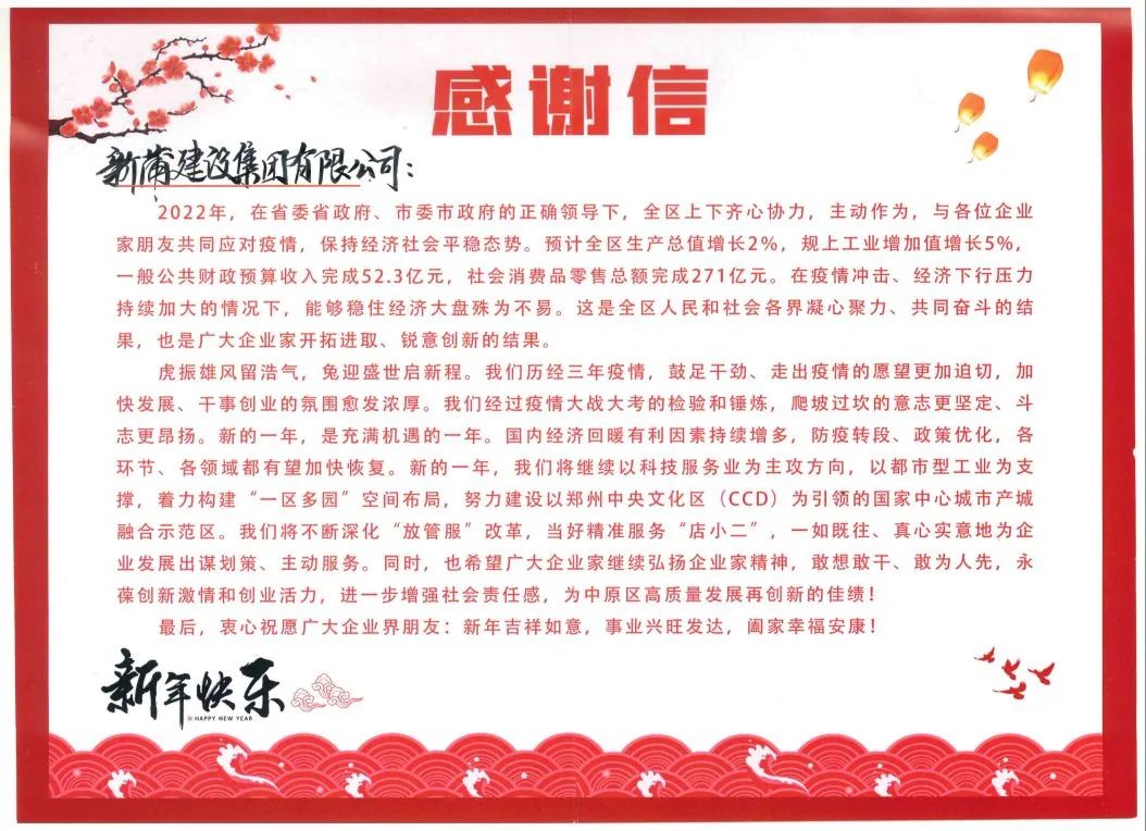 1月16日,我會副會長單位新蒲建設(shè)集團收到一封來自中原區(qū)人民政府的感謝信。中原區(qū)委常委、常務(wù)副區(qū)長劉斌一行專程將這封沉甸甸的感謝信送到了集團總部。集團公司執(zhí)行總經(jīng)理王建棋接待了領(lǐng)導(dǎo)一行,并進(jìn)行座談交流。