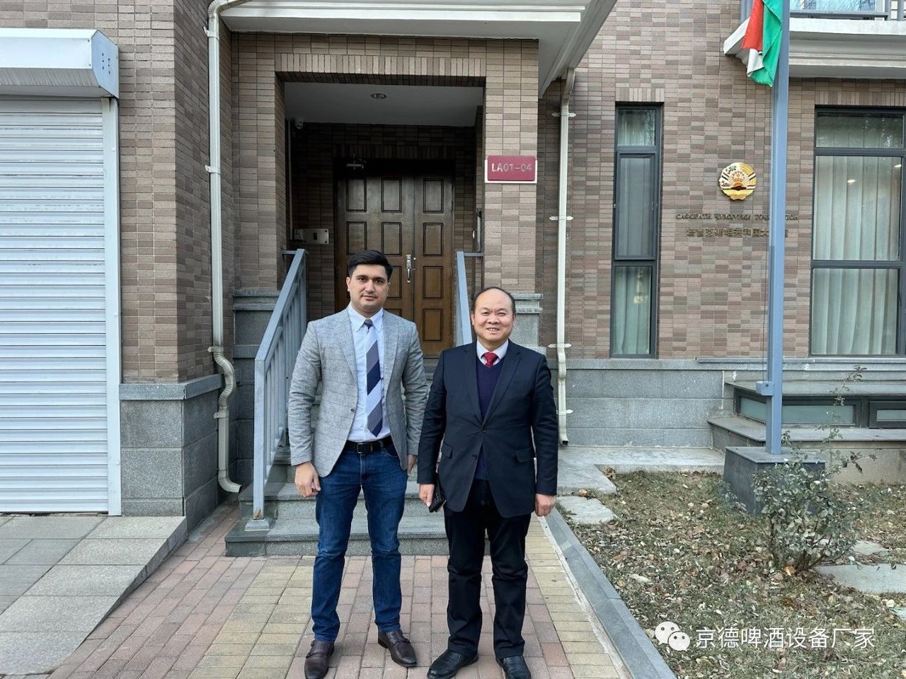 2023年1月19日,我會理事京德公司董事長仝奮飛博士一行,在北京應(yīng)邀參觀塔吉克斯坦共和國駐華大使館,仝奮飛董事長與該國商務(wù)參贊菲魯茲先生再次洽談了京德啤酒設(shè)備出口事宜和精釀啤酒、威士忌生產(chǎn)。