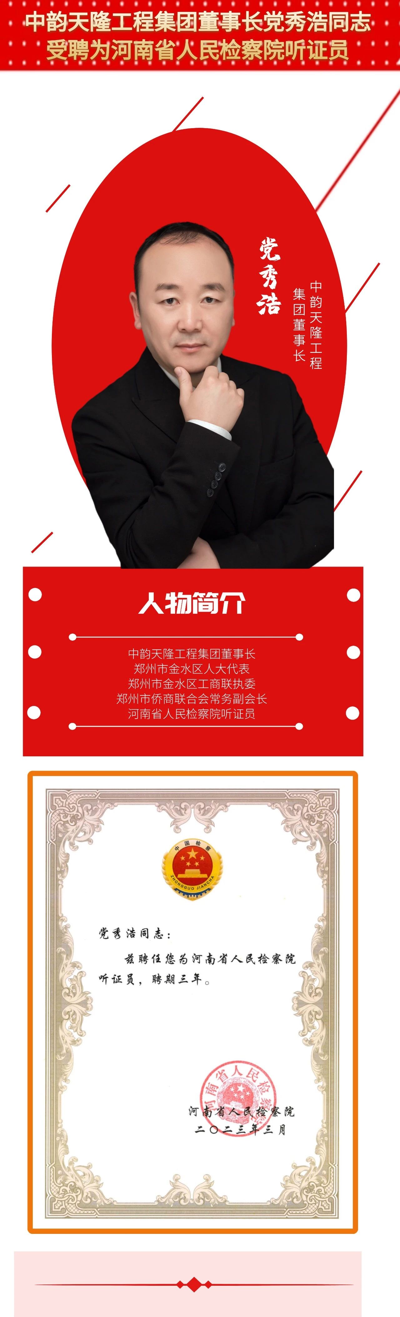 3月30日上午,河南省人民檢察院聽證員聘任儀式舉行,中韻天隆工程集團(tuán)董事長、金水區(qū)人大代表黨秀浩同志受聘為河南省人民檢察院聽證員。