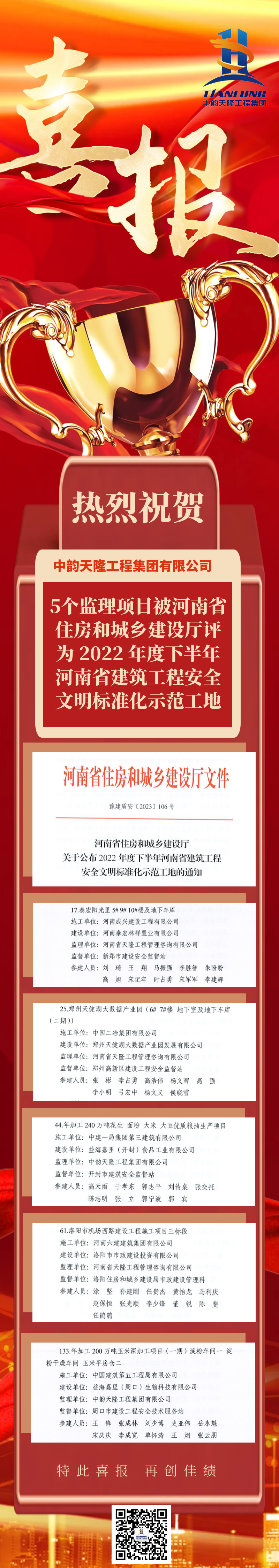 【會(huì)員動(dòng)態(tài)】祝賀!我會(huì)常務(wù)理事單位中韻天隆工程集團(tuán)5個(gè)監(jiān)理項(xiàng)目被河南省住房和城鄉(xiāng)建設(shè)廳評(píng)為 2022 年度下半年河南省建筑工程安全文明標(biāo)準(zhǔn)化示范工地