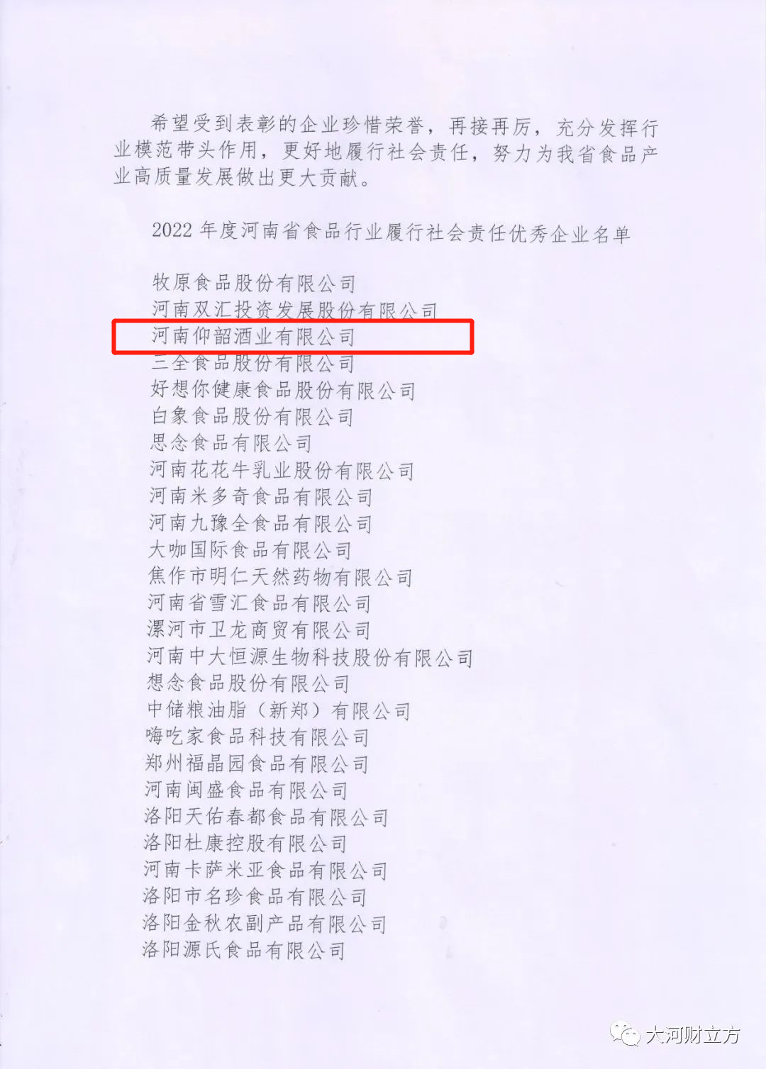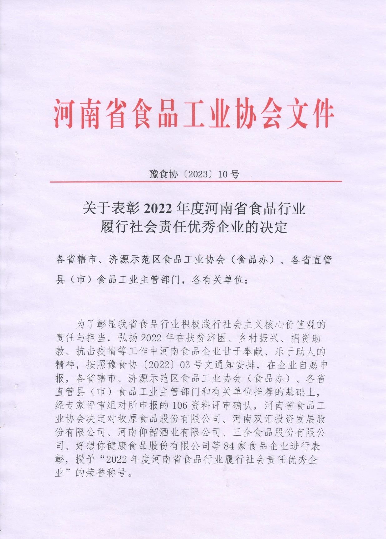 為了彰顯我省食品行業(yè)積極踐行社會主義核心價值觀的責任與擔當,弘揚2022年在扶貧濟困、鄉(xiāng)村振興、捐資助教、抗擊疫情等工作中河南食品企業(yè)甘于奉獻、樂于助人的精神,按照豫食協(xié)〔2022〕03號文通知安排,在企業(yè)自愿申報,各省轄市、濟源示范區(qū)食品工業(yè)協(xié)會(食品辦)、各省直管縣(市)食品工業(yè)主管部門和有關(guān)單位推薦的基礎(chǔ)上,經(jīng)專家評審組對所申報的106資料評審確認,河南省食品工業(yè)協(xié)會決定對牧原食品股份有限公司、河南雙匯投資發(fā)展股份有限公司、三全食品股份有限公司、好想你健康食品股份有限公司以及我會副會長單位河南仰韶酒業(yè)有限公司等84家食品企業(yè)進行表彰,授予“2022年度河南省食品行業(yè)履行社會責任優(yōu)秀企業(yè)”的榮譽稱號。