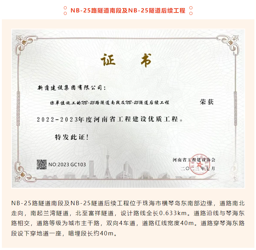 近日,從河南省工程建設協(xié)會傳來喜訊,我會輪值會長單位新蒲建設集團有限公司承建的“NB-25路隧道南段及NB-25隧道后續(xù)工程”、“濮陽職業(yè)技術學院校園基礎設施綜合提升工程16號宿舍樓”,雙雙被評為“河南省工程建設優(yōu)質(zhì)工程”!