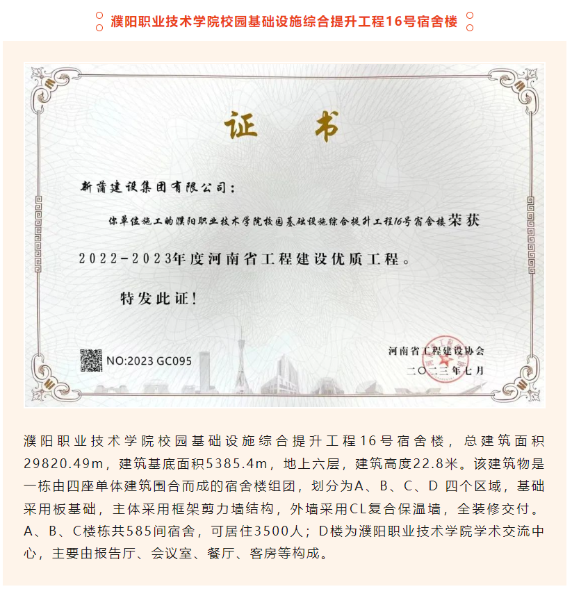 此次再獲河南省工程建設優(yōu)質(zhì)工程獎,是對新蒲建設集團綜合實力的充分肯定,對推動集團公司高質(zhì)量發(fā)展,提升集團公司知名度,起到積極促進作用。新蒲建設集團將始終如一把工程質(zhì)量作為企業(yè)生存發(fā)展之本,不斷提高工程質(zhì)量管理水平,持續(xù)打造更多精品工程,努力為區(qū)域發(fā)展貢獻力量。