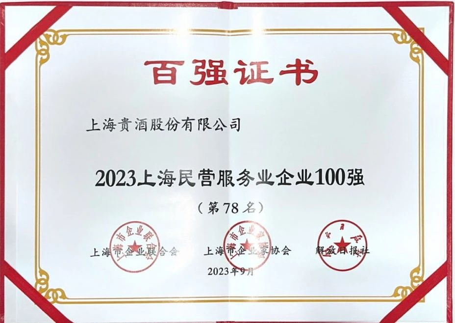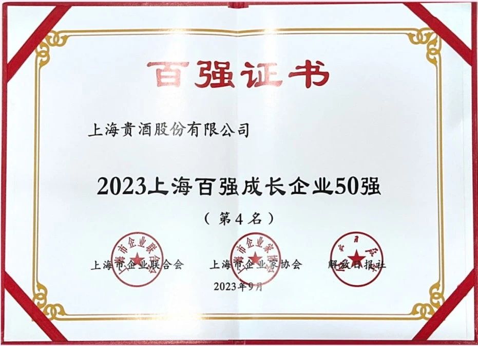 9月12日,上海市企業(yè)聯(lián)合會、上海市企業(yè)家協(xié)會、上海市經(jīng)濟(jì)團(tuán)體聯(lián)合會和解放日報社聯(lián)合召開2023上海百強(qiáng)企業(yè)新聞發(fā)布會,正式發(fā)布上海百強(qiáng)企業(yè)系列榜單。我會常務(wù)理事單位上海貴酒榮登“2023上海百強(qiáng)成長企業(yè)50強(qiáng)”和“2023上海民營服務(wù)業(yè)企業(yè)100強(qiáng)”雙榜單!