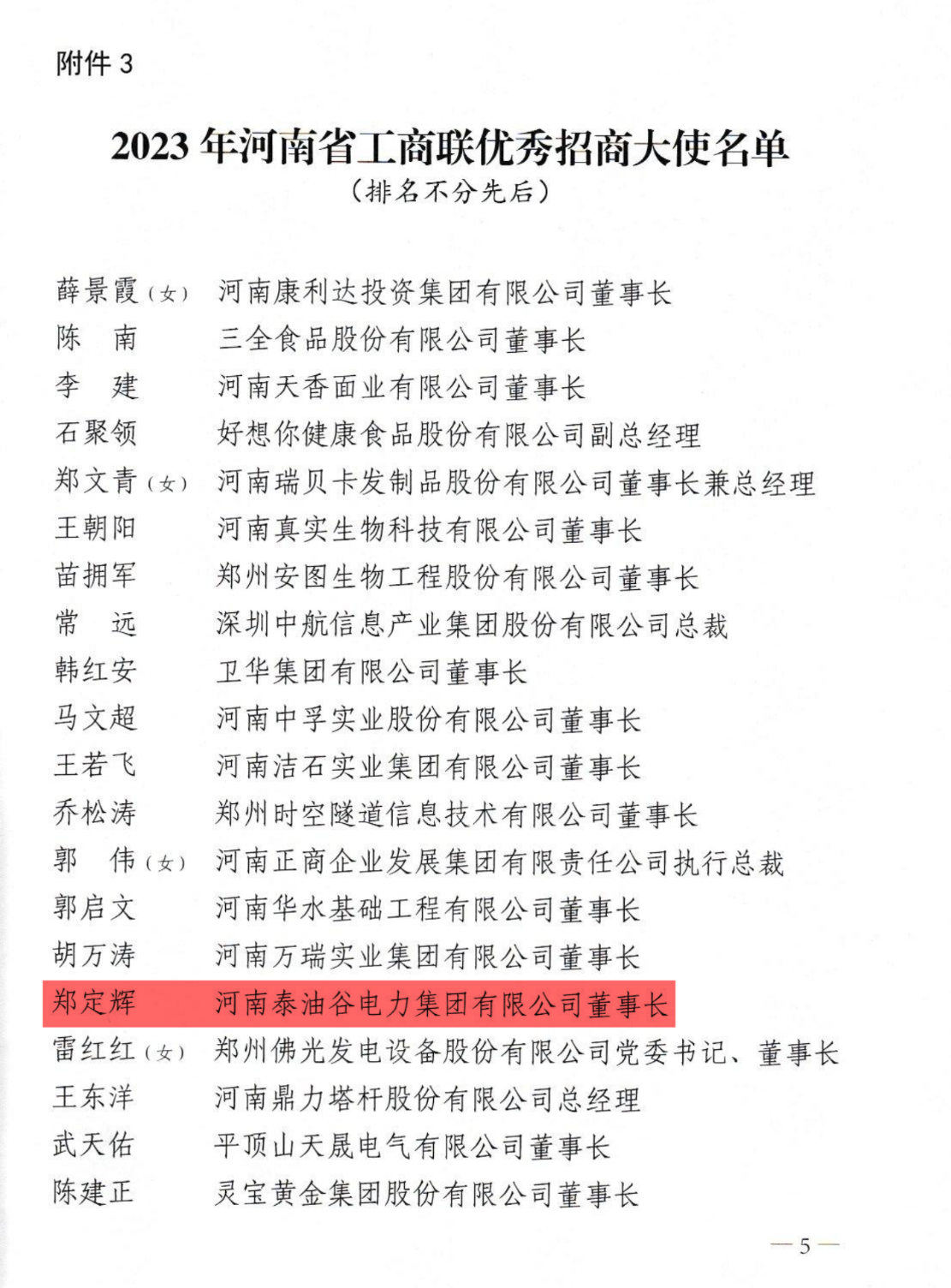 2024年1月11日,河南省工商聯(lián)印發(fā)了《關(guān)于表?yè)P(yáng)2023年度全省工商聯(lián)系統(tǒng)經(jīng)濟(jì)服務(wù)等工作先進(jìn)單位和先進(jìn)個(gè)人的決定》(豫聯(lián)發(fā)〔2024〕5號(hào)),其中,省僑商會(huì)常務(wù)副會(huì)長(zhǎng)、河南泰油谷電力集團(tuán)有限公司董事長(zhǎng)鄭定輝為“2023年河南省工商聯(lián)優(yōu)秀招商大使”。