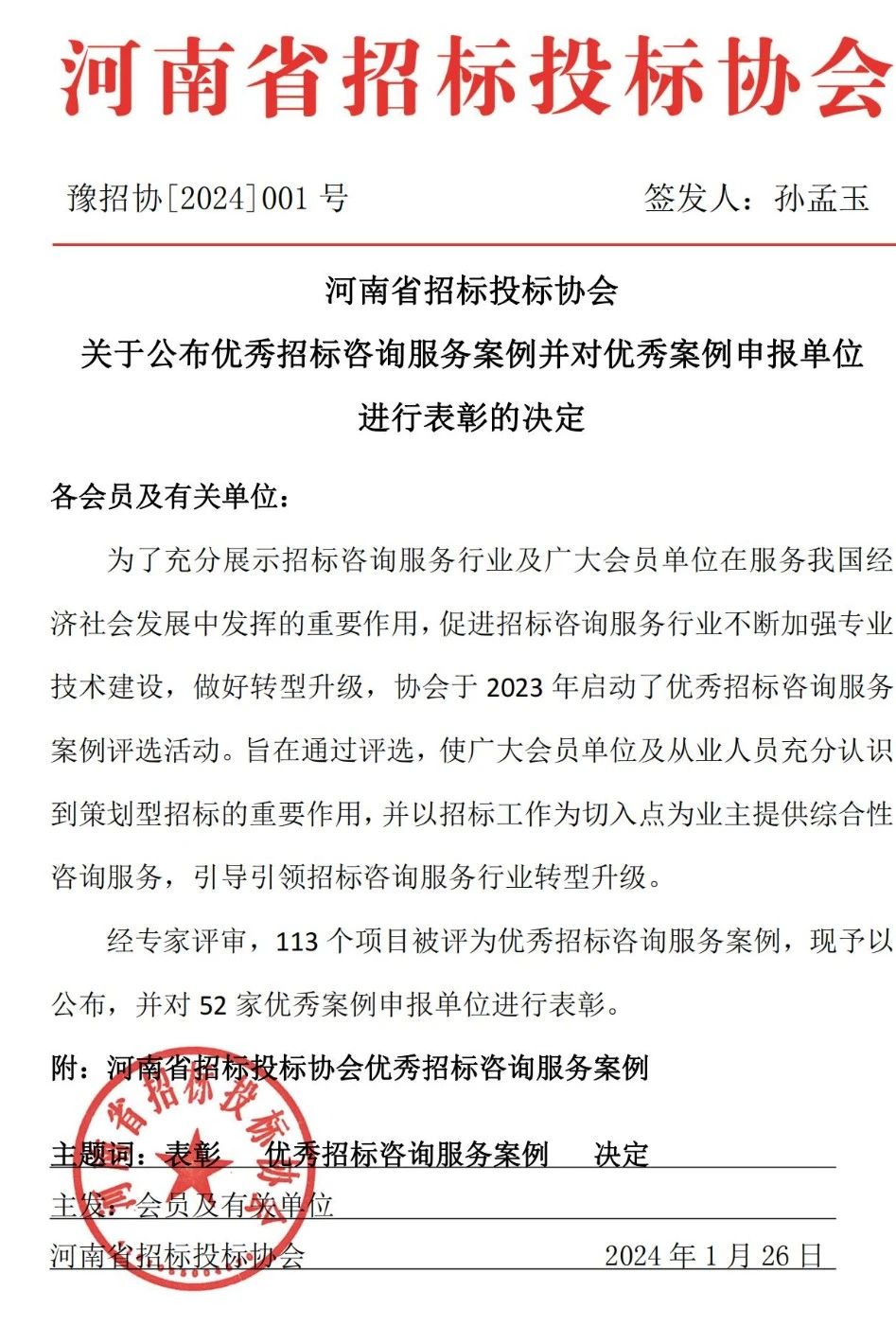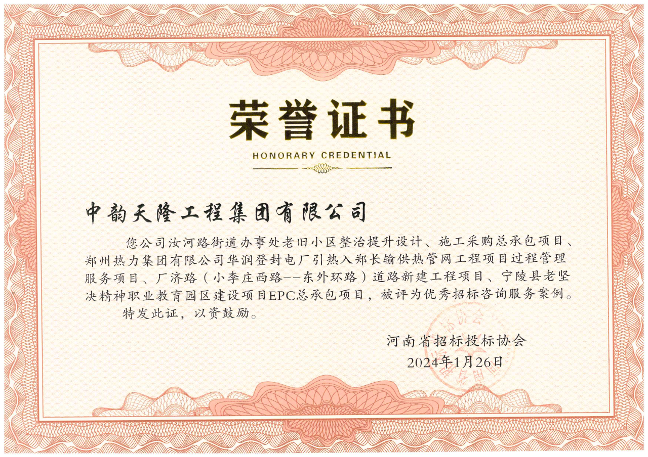 為了充分展示招標咨詢服務行業(yè)及廣大會員單位在服務我國經濟社會發(fā)展中發(fā)揮的重要作用,促進招標咨詢服務行業(yè)不斷加強專業(yè)技術建設,做好轉型升級,河南省招標投標協會于 2023 年啟動了優(yōu)秀招標咨詢服務案例評選活動,省僑商會副會長單位中韻天隆工程集團多項案例入選河南省招標投標協會優(yōu)秀招標咨詢服務案例。