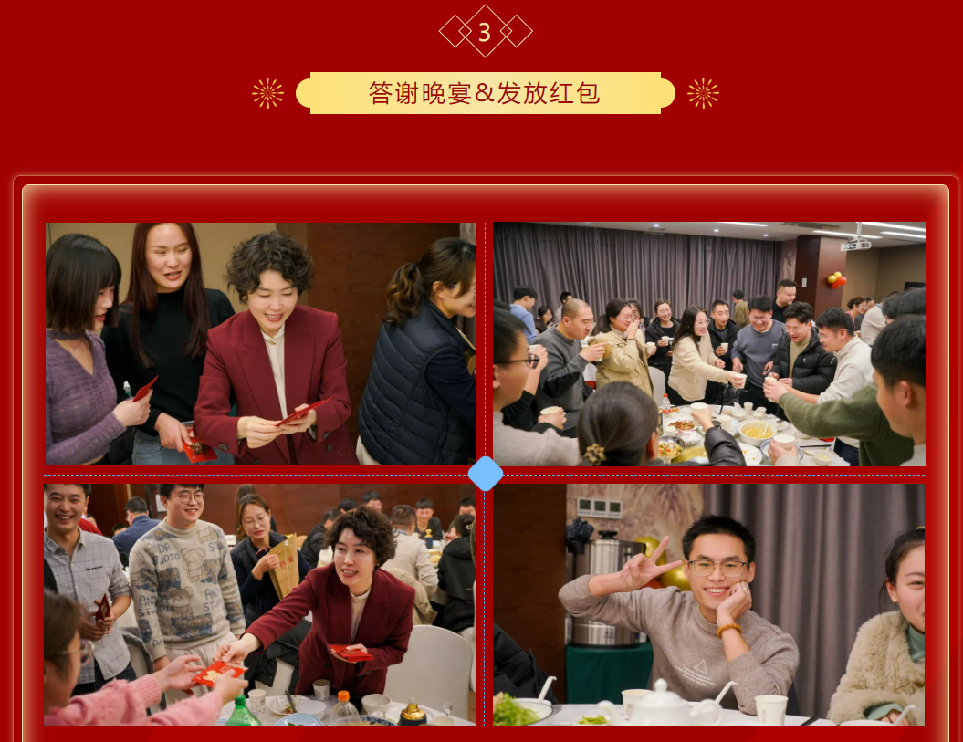 公司不忘家人們一年兢兢業(yè)業(yè)的辛苦奮斗與付出,為感謝大家對(duì)公司的一路支持與陪伴,公司為大家準(zhǔn)備了豐盛的晚宴,推杯換盞間過去一年的辛苦煙消云散。晚宴上,董事長(zhǎng)羅利女士親自為大家準(zhǔn)備并發(fā)放了過年紅包,把滿滿的心意及新春祝福送給大家