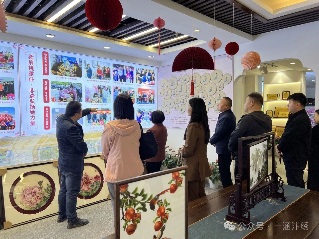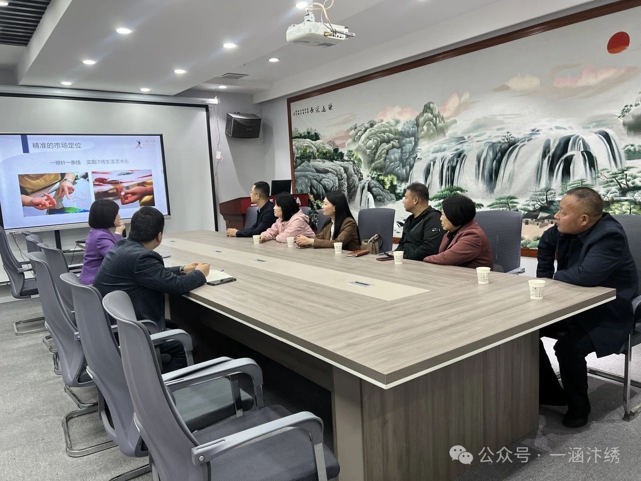 在董事長張留鳳的帶領(lǐng)下,開封市龍亭區(qū)婦聯(lián)領(lǐng)導(dǎo)及非遺傳承人王素花團(tuán)隊(duì)一行人首先參觀了一涵汴繡禮品展廳、文創(chuàng)展廳、軟裝展廳等,現(xiàn)場了解了一涵汴繡的發(fā)展歷程、運(yùn)營模式與發(fā)展規(guī)劃等情況,觀摩了不同種類汴繡產(chǎn)品的應(yīng)用場景,并圍繞非遺資源、運(yùn)營創(chuàng)新、數(shù)字經(jīng)濟(jì)等方面進(jìn)行座談交流。