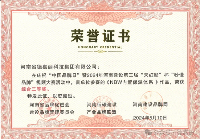 我會執(zhí)行會長單位河南省德嘉麗科技集團有限公司榮獲2023年度河南建設(shè)品牌“低碳引領(lǐng)品牌”先進單位,這項榮譽是對德嘉麗多年來堅持踐行低碳環(huán)保理念、積極推廣綠色建材的肯定。德嘉麗始終將可持續(xù)發(fā)展放在首位,重點研發(fā)的“NBW建筑構(gòu)保溫一體化體系”,被住建部評為國內(nèi)同行業(yè)領(lǐng)先、國際首創(chuàng)。