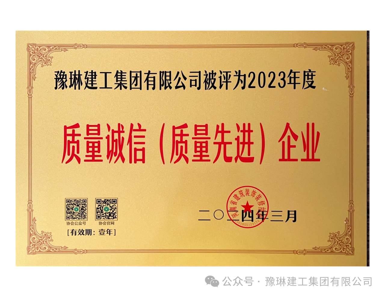 2024年3月,豫琳建工集團(tuán)限公司被河南省建筑裝飾裝修協(xié)會評為2023年度質(zhì)量誠信(先進(jìn))企業(yè)。