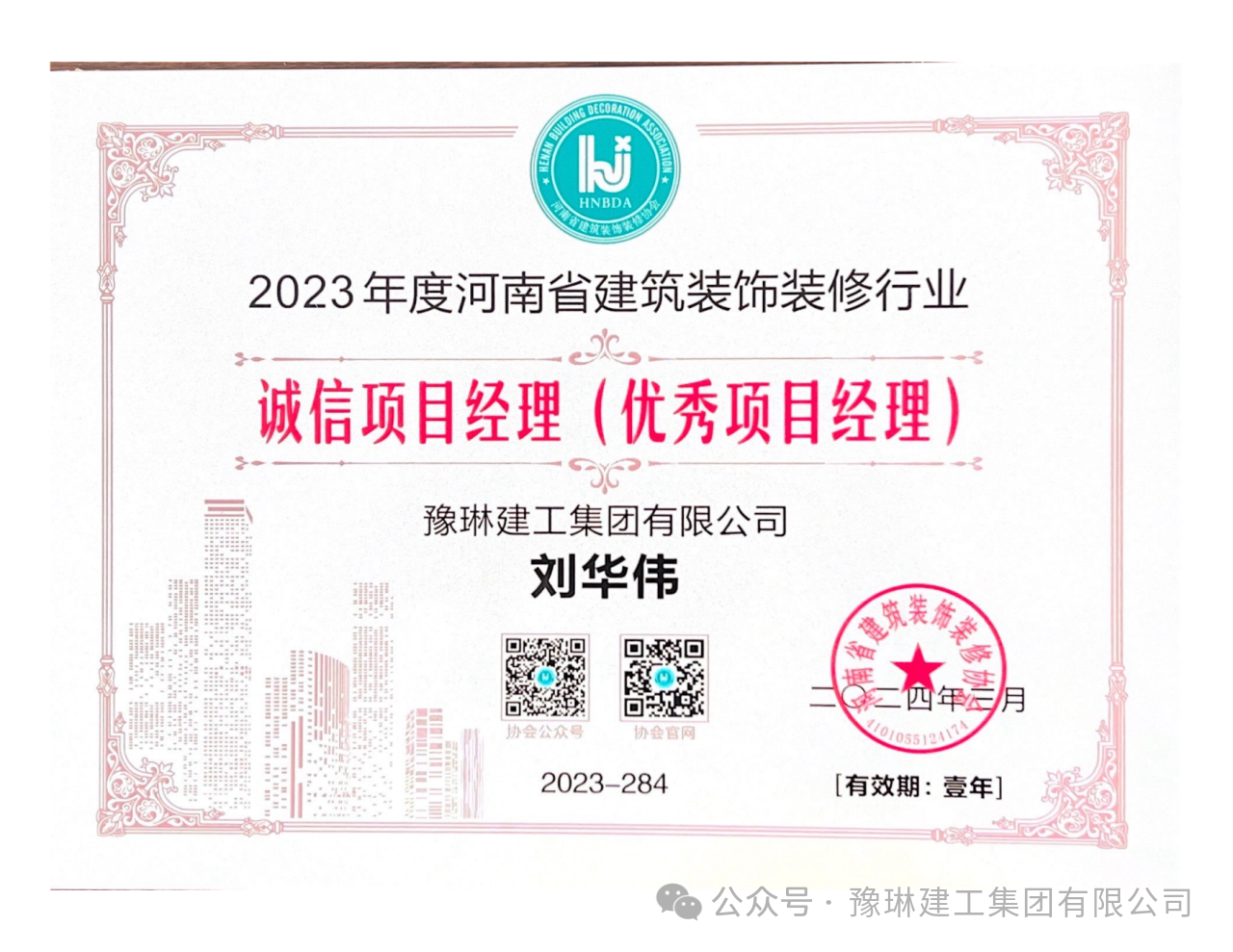 公司項目經(jīng)理劉華偉榮獲 “誠信項目經(jīng)理(優(yōu)秀項目經(jīng)理)”