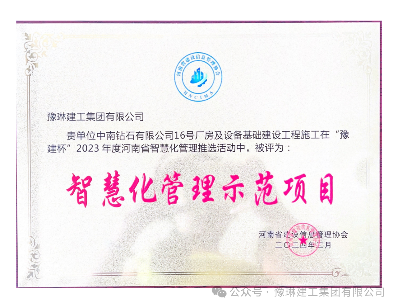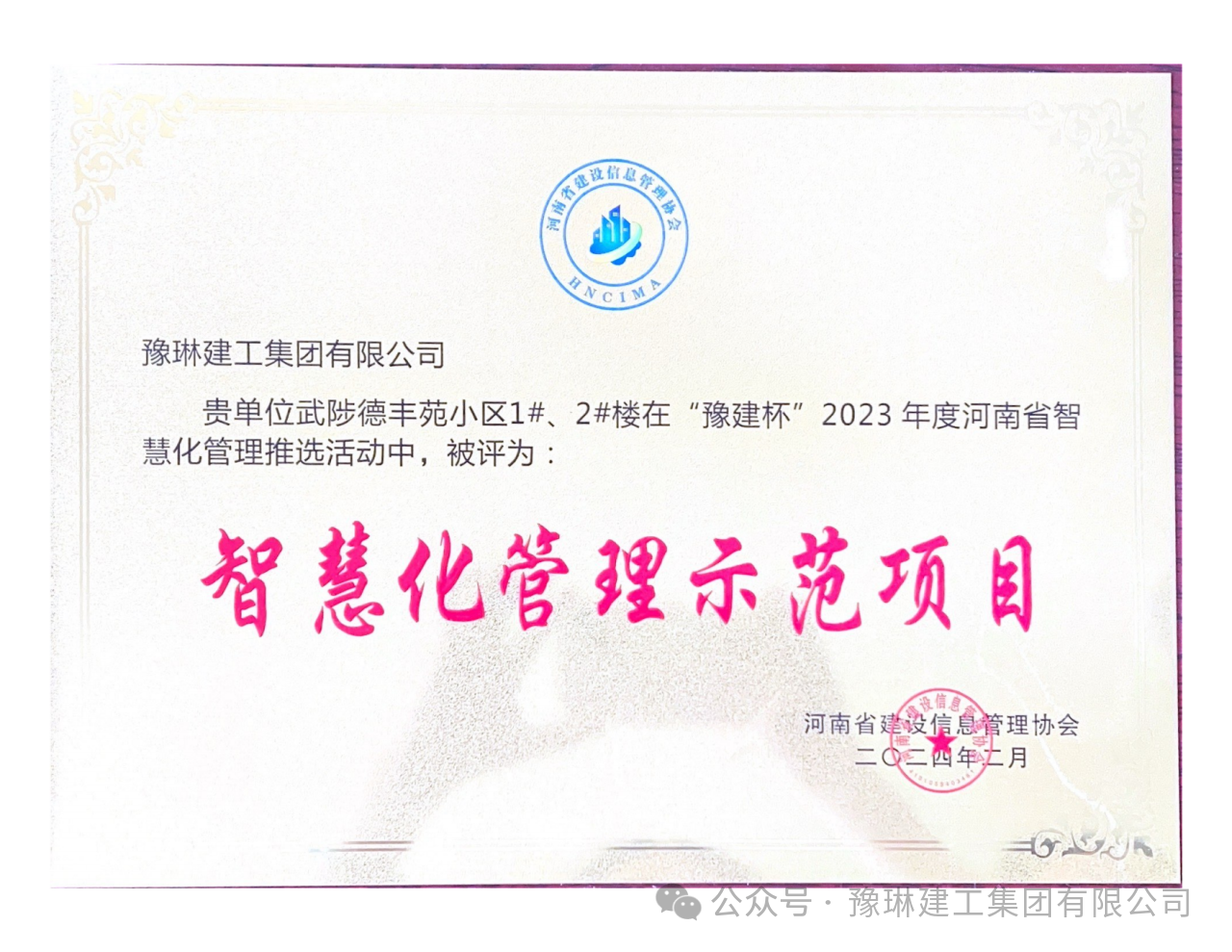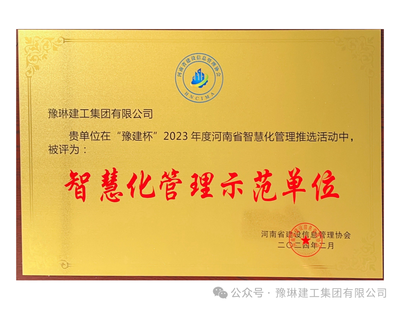2024年2月。豫琳建工集團(tuán)有限公司被河南省建設(shè)信息管理協(xié)會在“豫建杯”2023年度河南省智慧化管理推選活動中評為:智慧化管理示范單位。