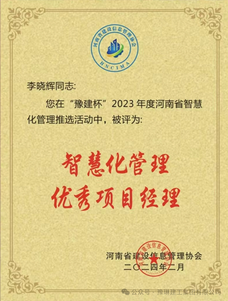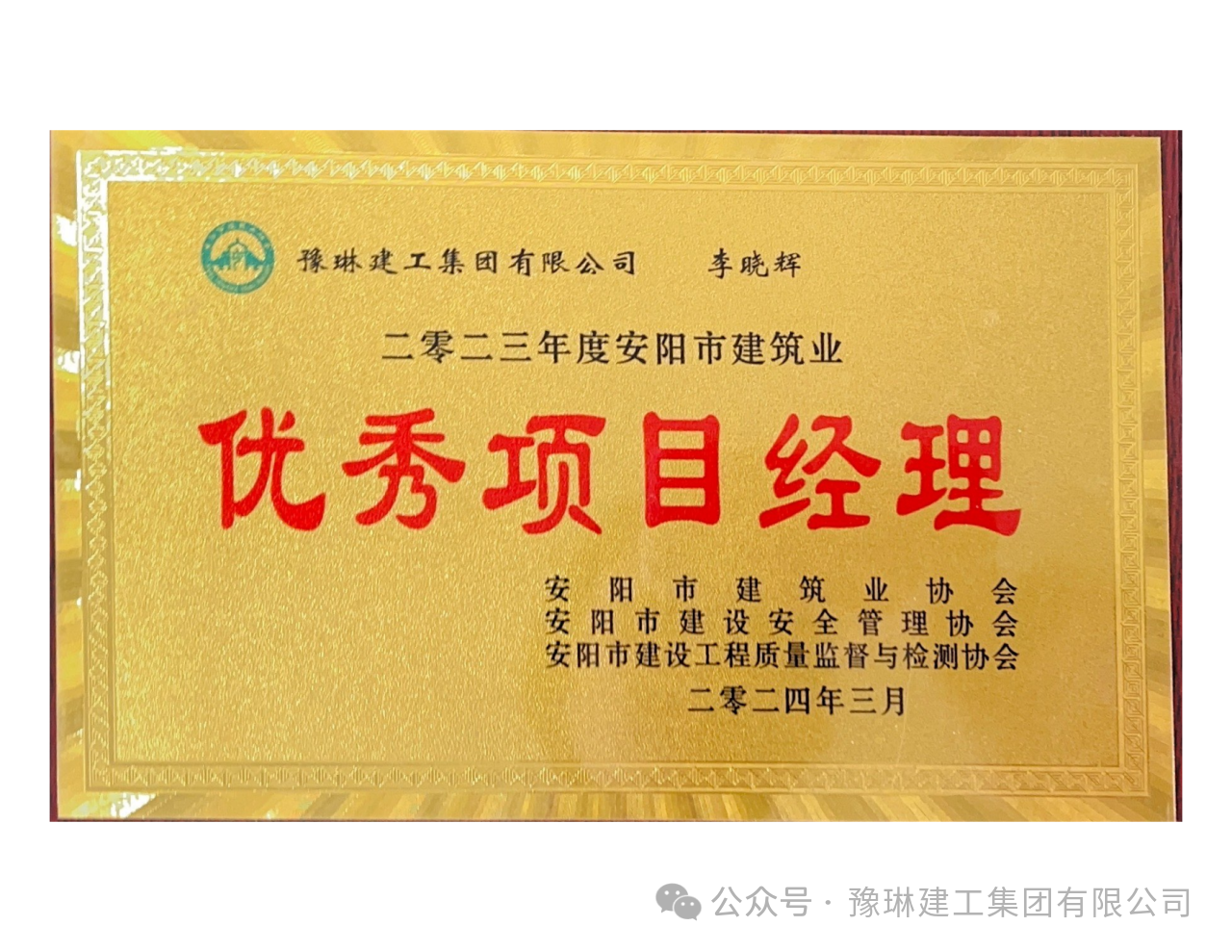 2024年3月,公司項目經(jīng)理李曉輝在2023年度安陽市建筑業(yè)被評為:“優(yōu)秀項目經(jīng)理”