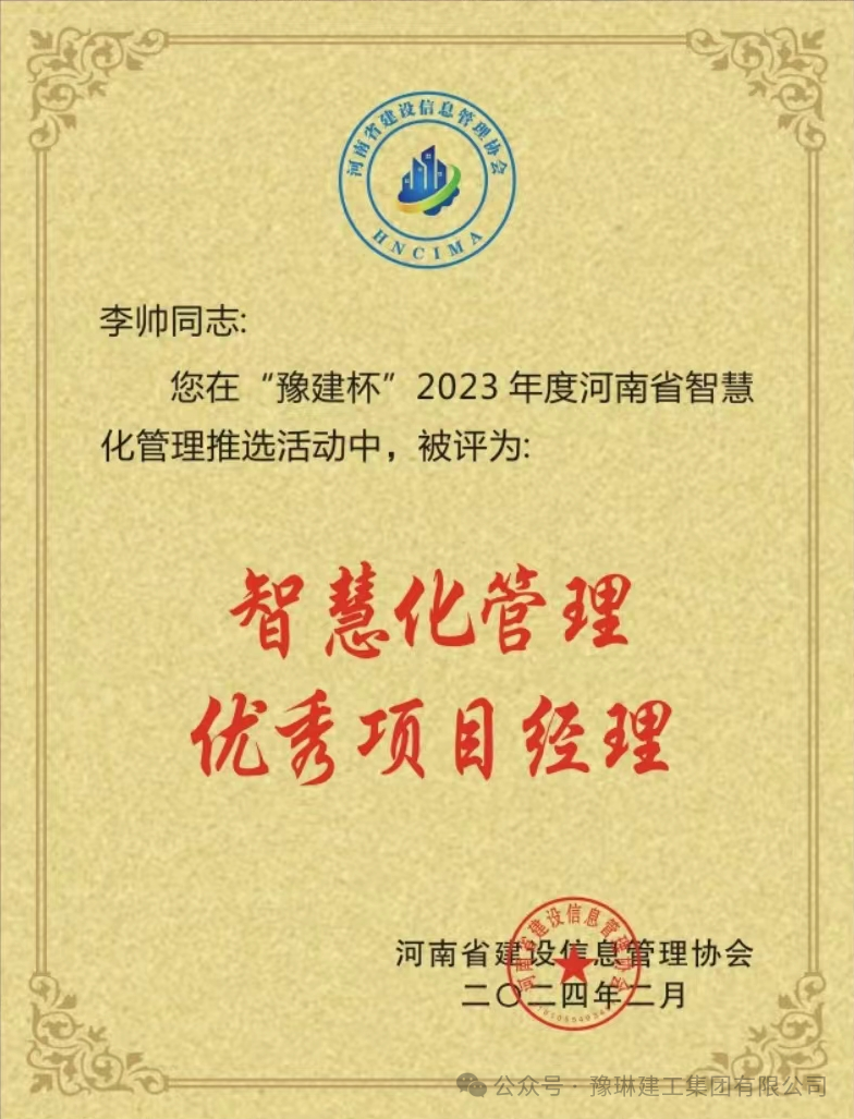 公司項目經(jīng)理李曉輝、李帥榮獲 “智慧化管理優(yōu)秀項目經(jīng)理”