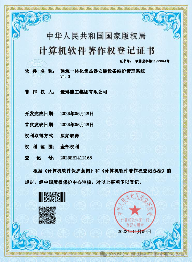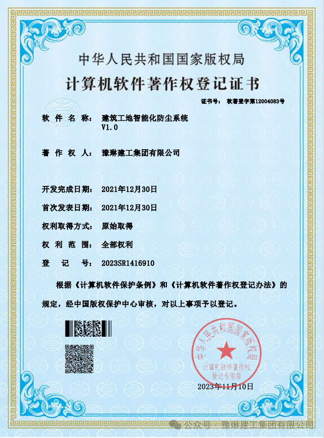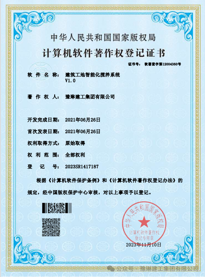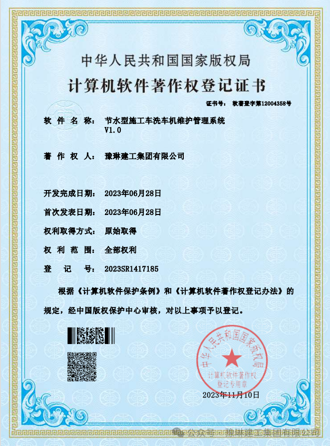 2023年11月,豫琳建工集團(tuán)有限公司獲得中華人民共和國國家產(chǎn)權(quán)局授予的高層建筑智能化送水系統(tǒng)V1.0、建筑工地智能化V1.0、建筑工地智能化攪拌系統(tǒng)V1.0、建筑一體化集熱器安裝設(shè)備維護(hù)管理系統(tǒng)V1.0、節(jié)水型施工車洗車機(jī)維護(hù)管理系統(tǒng)V1.0。展望未來,豫琳建工集團(tuán)將繼續(xù)努力,力爭在更多領(lǐng)域取得突破。我們期待與所有合作伙伴一起,共同探索新的合作機(jī)會,共創(chuàng)更加輝煌的未來。