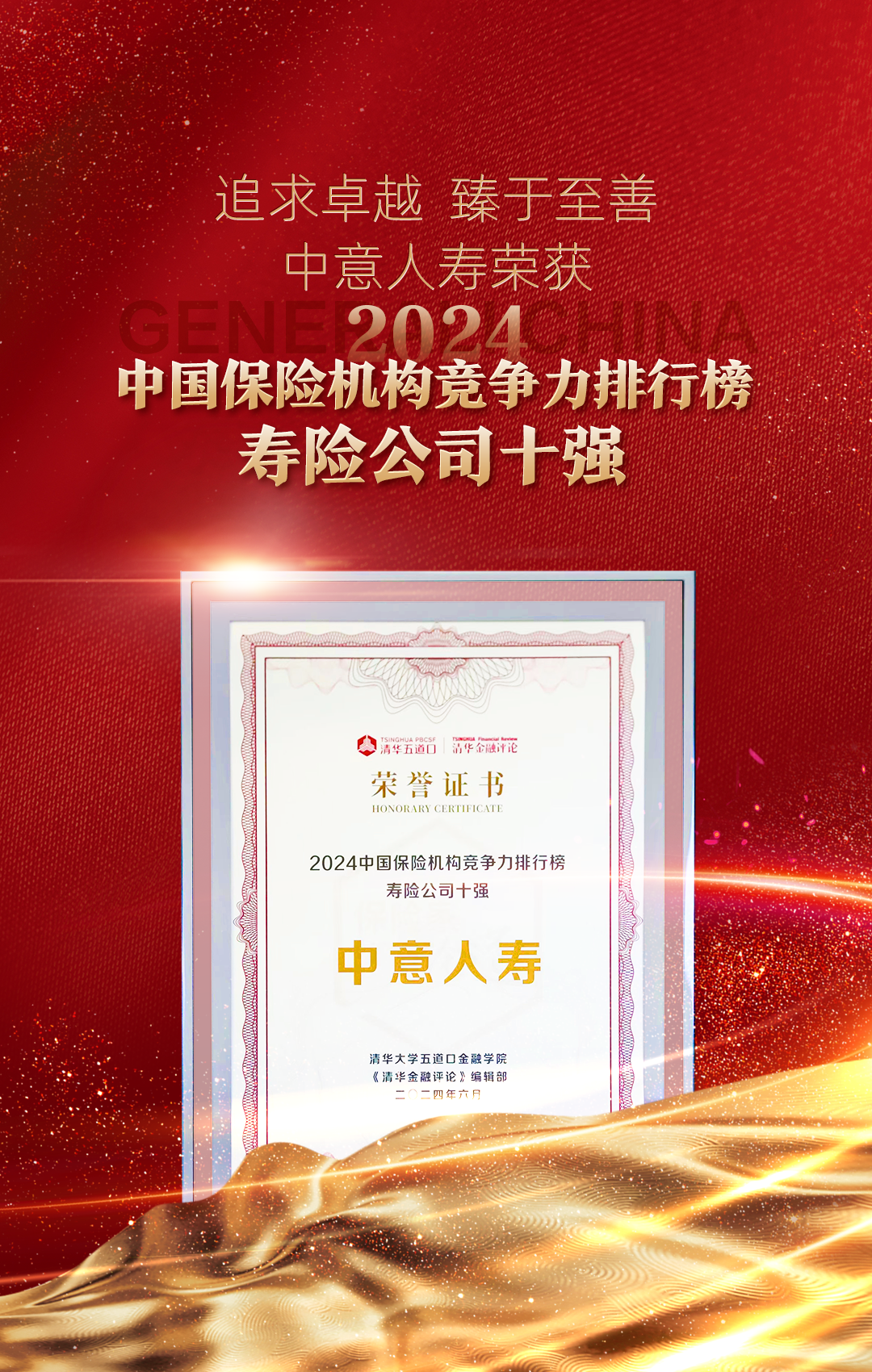 中意人壽保險(xiǎn)有限公司(以下簡(jiǎn)稱為“中意人壽”)在此次評(píng)選中榮獲“2024中國(guó)保險(xiǎn)機(jī)構(gòu)競(jìng)爭(zhēng)力排行榜壽險(xiǎn)公司十強(qiáng)”。