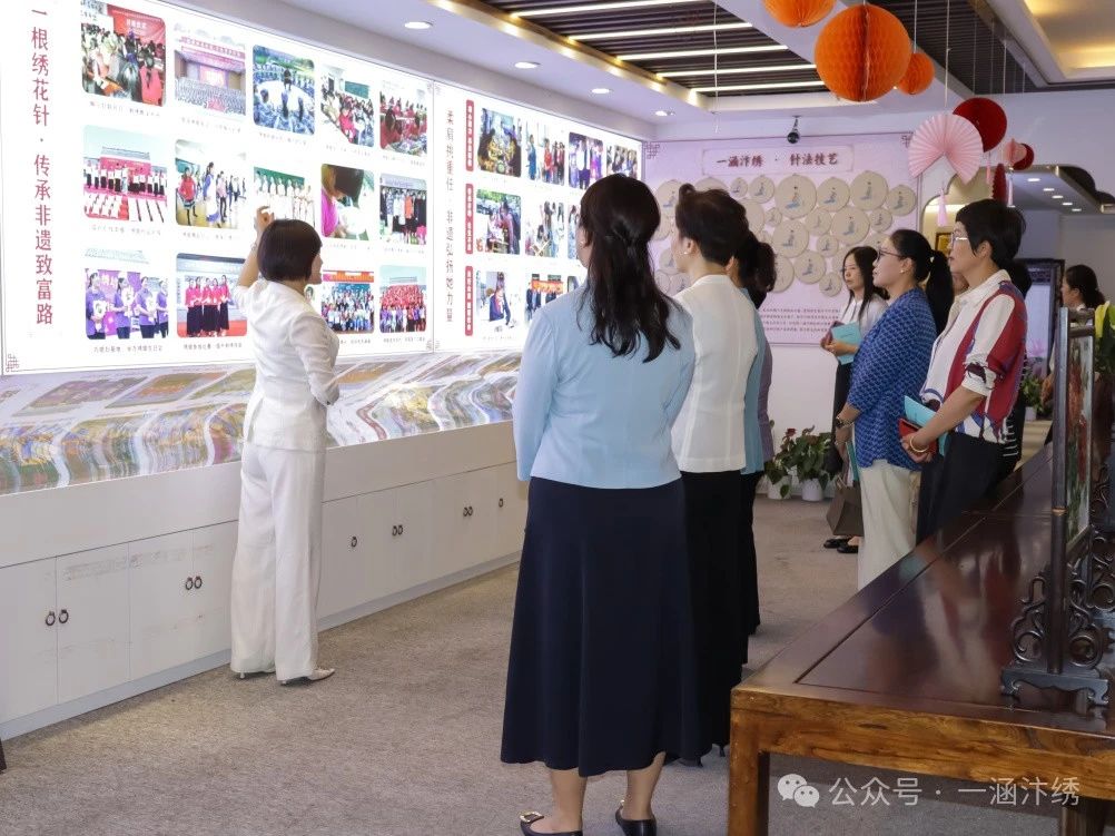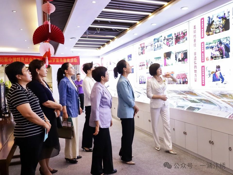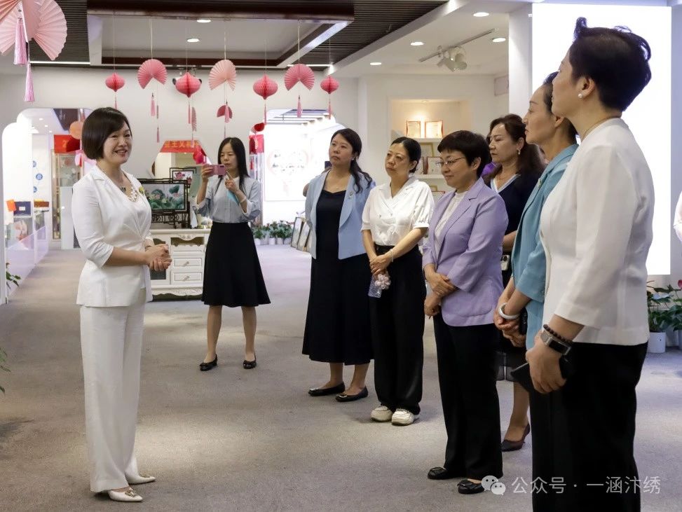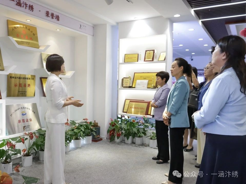 在一涵汴繡文化墻,董事長張留鳳講述了這面文化墻背后的意義,它是一涵汴繡帶動農村婦女巧手致富與傳承非遺文化的具體體現(xiàn)。通過免費對農村婦女進行拓展訓練、書畫培訓、刺繡培訓、形態(tài)禮儀培訓等,探索出一條具有特色的“刺繡扶貧”模式,讓她們能夠留在家,繡著花,看著娃,養(yǎng)著家。姜淑霞主席一行對一涵汴繡積極承擔社會責任,帶隊女性創(chuàng)業(yè)就業(yè)的行為表示了高度贊賞。