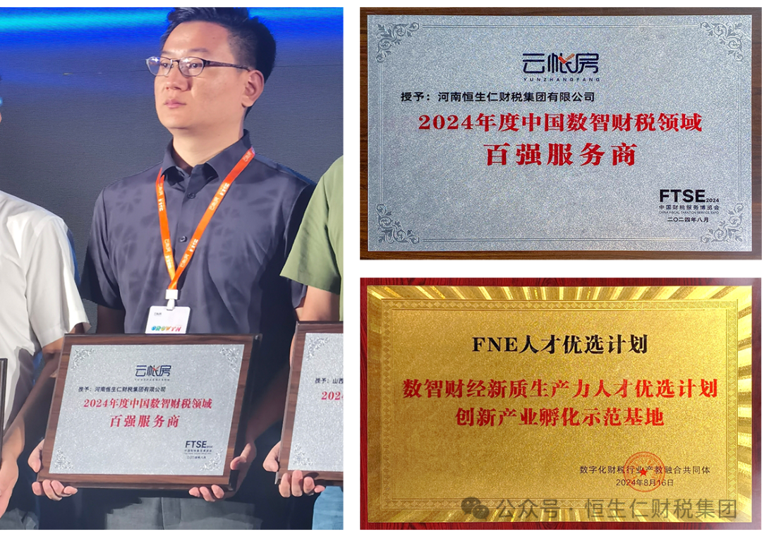 本次中國財稅服務(wù)博覽會上恒生仁財稅集團(tuán)憑借卓越的專業(yè)能力和創(chuàng)新的服務(wù)模式,榮獲“全國財稅百強服務(wù)商”以及“數(shù)智財經(jīng)人才示范基地”榮譽。