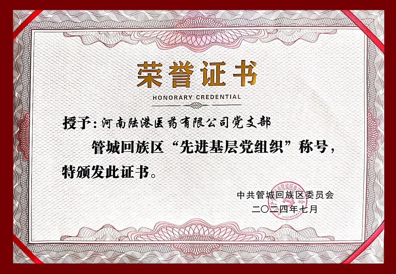近日,我會副會長單位河南陸港醫(yī)藥有限公司黨支部獲評鄭州市管城回族區(qū)“先進基層黨組織”榮譽稱號。