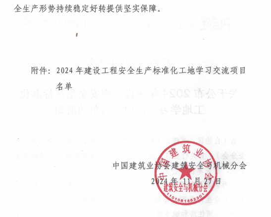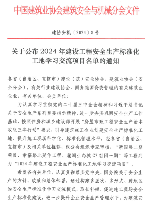 近日,中國(guó)建筑業(yè)協(xié)會(huì)建筑安全與機(jī)械分會(huì)正式公布了《2024年建設(shè)工程安全生產(chǎn)標(biāo)準(zhǔn)化工地學(xué)習(xí)交流項(xiàng)目名單》,