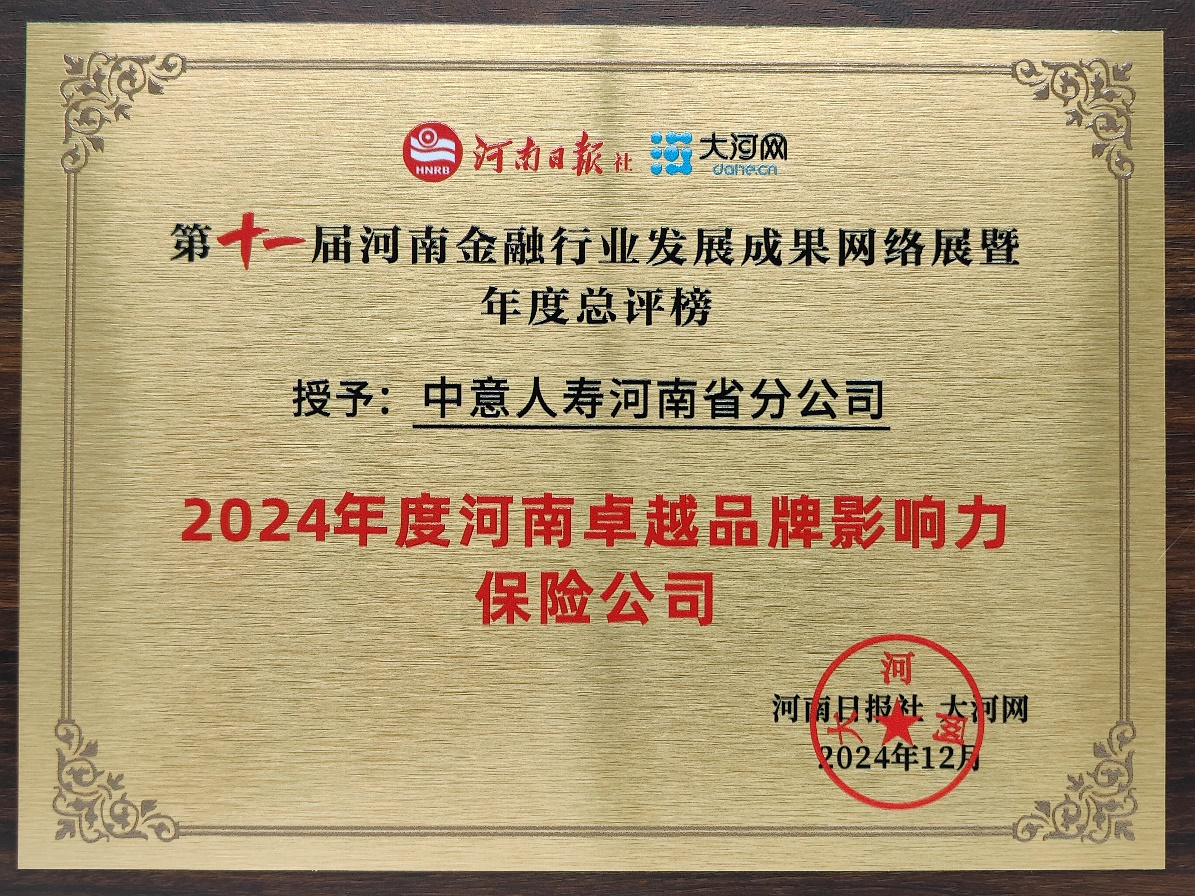 此次榮獲“2024年度河南卓越品牌影響力保險公司”榮譽稱號,是對中意人壽河南省分公司過去一年工作的充分肯定,也是對未來發(fā)展的鞭策和激勵。中意人壽河南省分公司將繼續(xù)秉持“成為客戶終身伙伴”的理念,不斷提升服務(wù)品質(zhì),加強品牌建設(shè),為客戶提供更加優(yōu)質(zhì)、便捷的保險服務(wù),為河南金融行業(yè)的繁榮發(fā)展貢獻更多力量。