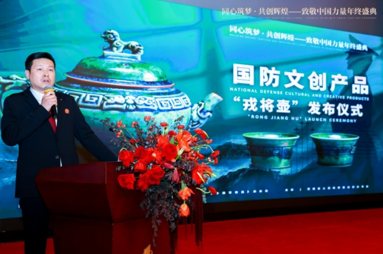 我會(huì)常務(wù)理事、宣政官窯創(chuàng)始人劉明臣在盛典上,發(fā)布文創(chuàng)新品“戎將壺”