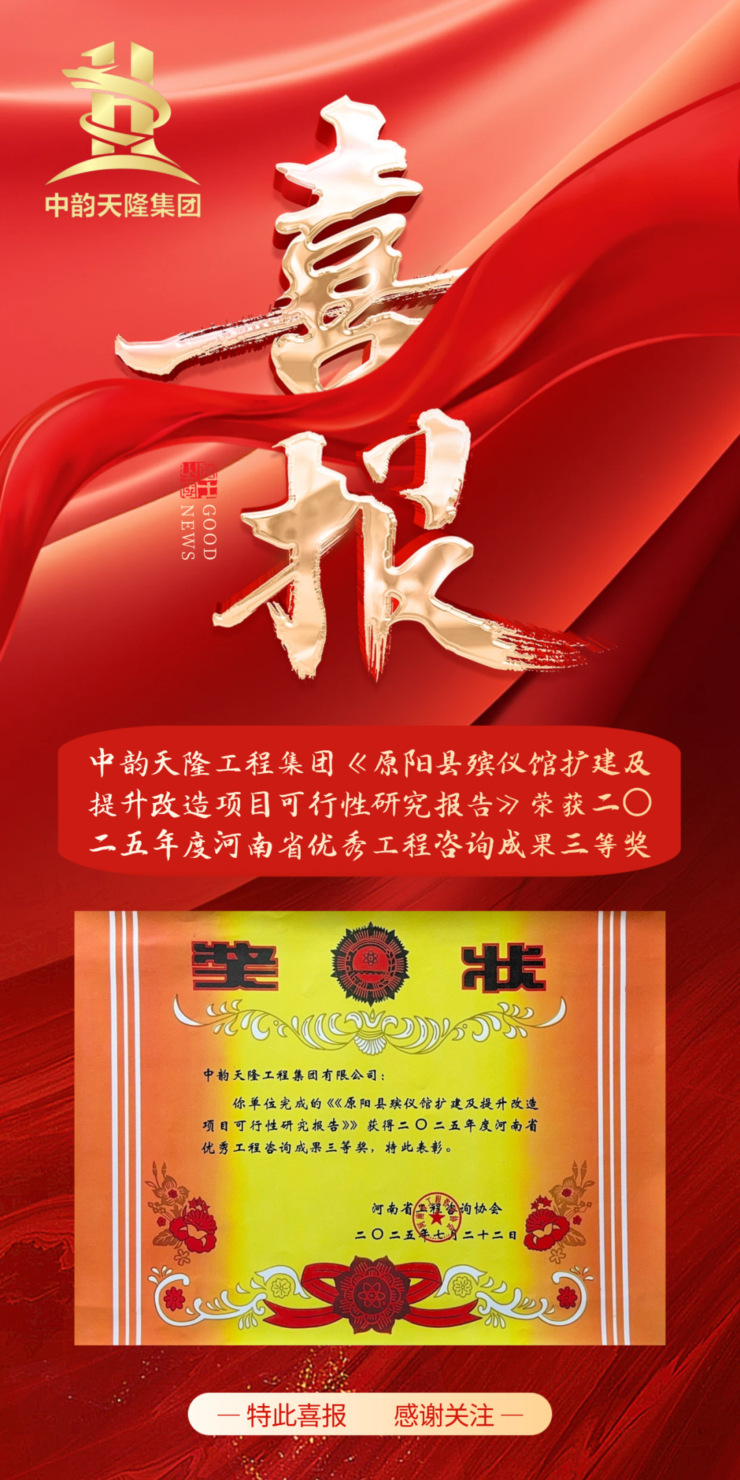 【會(huì)員動(dòng)態(tài)】喜報(bào) | 河南省僑商聯(lián)合會(huì)副會(huì)長(zhǎng)單位中韻天隆工程集團(tuán)咨詢項(xiàng)目榮獲二〇二五年度河南省優(yōu)秀工程咨詢成果三等獎(jiǎng)