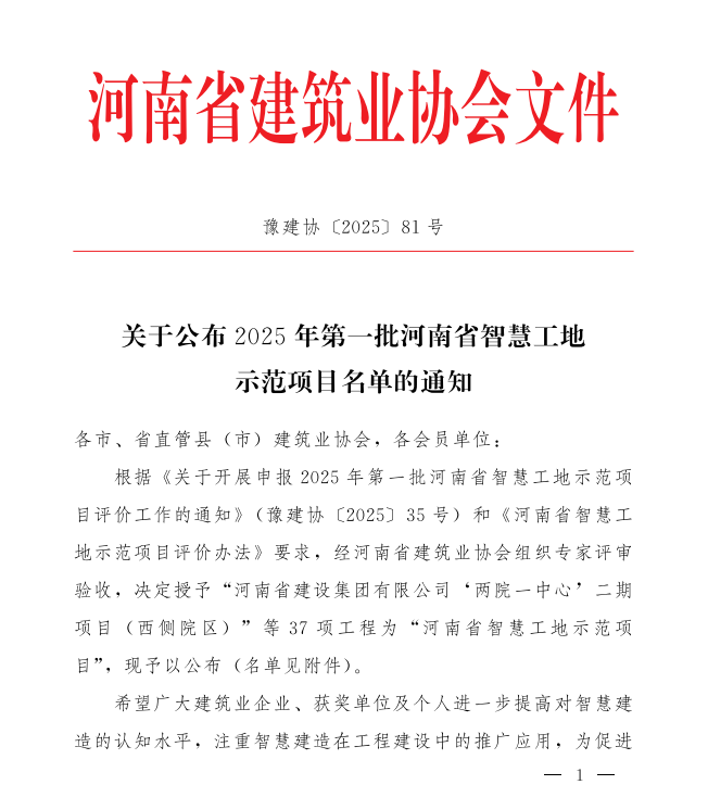 近日,河南省建筑業(yè)協(xié)會公布了“2025年第一批河南省智慧工地示范項目”名單,由河南省僑商聯(lián)合會副會長單位新蒲建設集團精心開發(fā)建設的朗晴別院項目榮耀上榜。