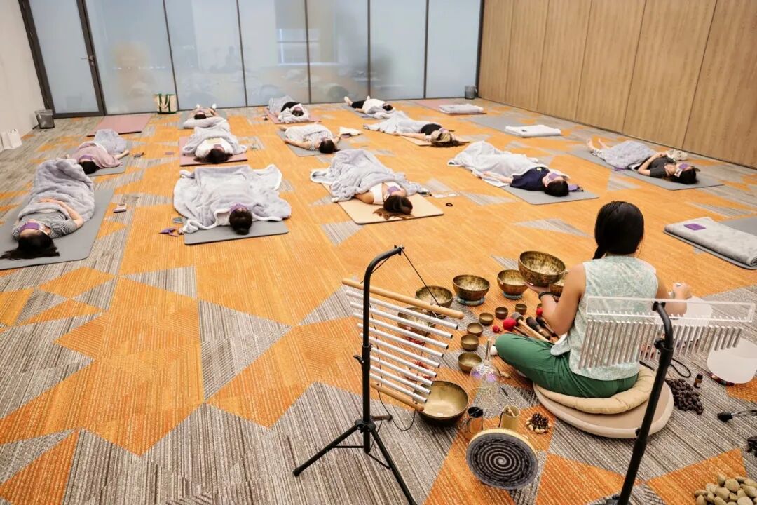 頌缽冥想工作坊為參與者帶來沉浸式聲音療愈。在專業(yè)老師的引導(dǎo)下,大家閉目靜坐,清澈深遠(yuǎn)的缽音緩緩流淌,幫助釋放壓力與焦慮。