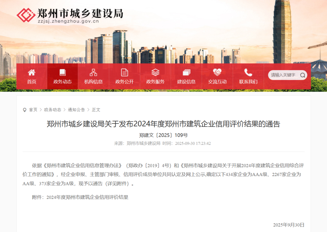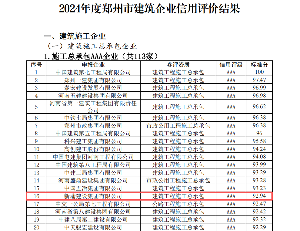 近日,鄭州市城鄉(xiāng)建設局發(fā)布《關于發(fā)布2024年度鄭州市建筑企業(yè)信用評價結果的通告》(鄭建文〔2025〕109號),新蒲建設集團有限公司憑借深厚的行業(yè)積淀、扎實的技術實力與優(yōu)異的信用表現(xiàn),在此次評價中成功斬獲建筑工程施工總承包AAA級榮譽。
