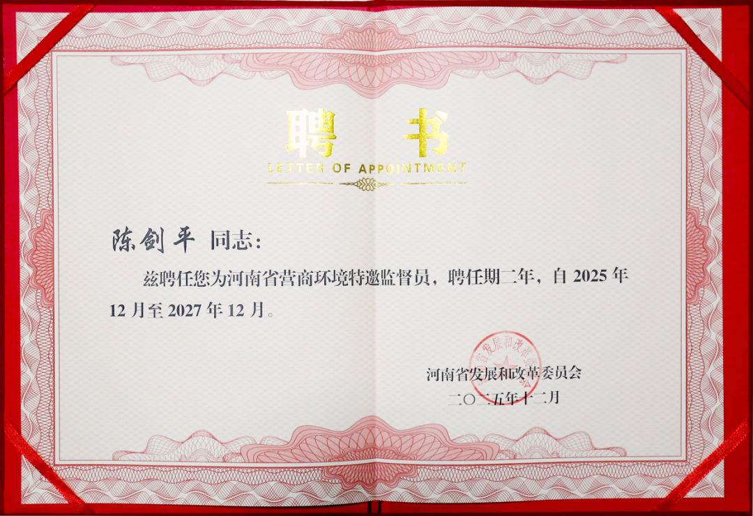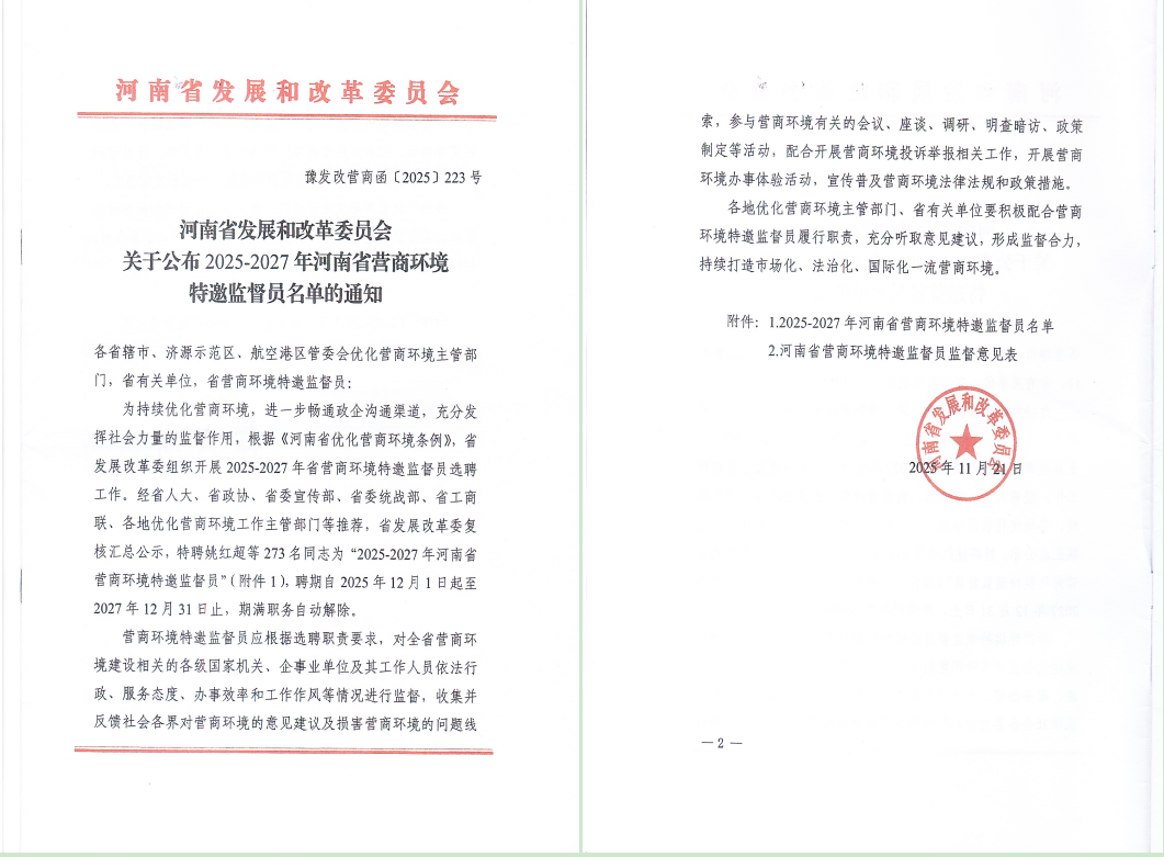 近日,河南省發(fā)展和改革委員會正式啟動2025—2027年度營商環(huán)境特邀監(jiān)督員選聘工作。河南華東電纜股份有限公司黨支部書記、董事長陳劍平成功入選,獲聘為該批次特邀監(jiān)督員。此次選聘經(jīng)多部門聯(lián)合推薦、綜合復(fù)核并公示確定,監(jiān)督員隊伍涵蓋企業(yè)、學(xué)界、協(xié)會等多領(lǐng)域代表,旨在構(gòu)建廣泛參與的社會監(jiān)督機制。
