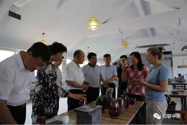 走訪中,調(diào)研組一行先后參觀了孔家鈞窯投資興建的中國鈞瓷文化園、禹州鈞瓷文化博物館,看望了正在中國鈞瓷文化園駐場創(chuàng)作的臺灣陶藝家黃玉英、立陶宛陶藝家Ruta Sipalyte,詳細了解孔家鈞窯的科技研發(fā)、生產(chǎn)經(jīng)營以及黨外知識分子崗位建功情況。