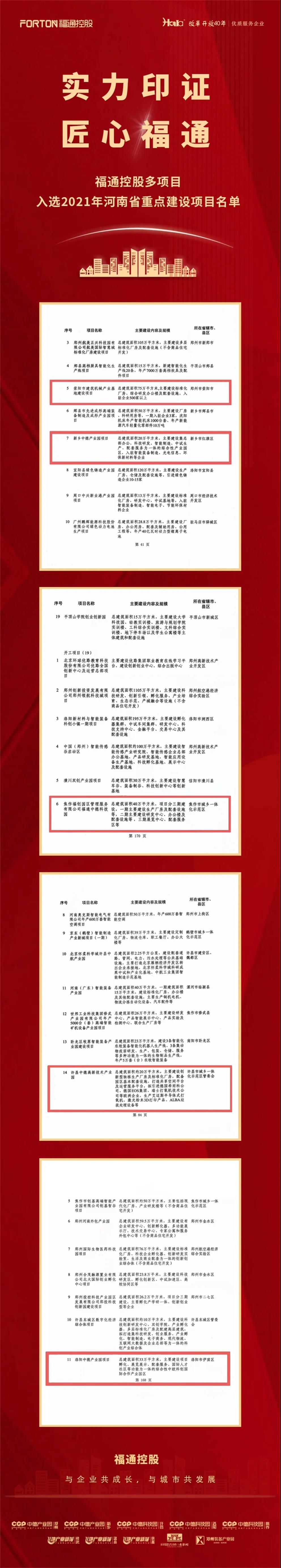 這其中不乏多次入選的項(xiàng)目,如:新鄉(xiāng)中德、洛陽(yáng)中德和鄭州裝備產(chǎn)業(yè)園;也有后續(xù)發(fā)力首次入選的項(xiàng)目:許昌中德、焦作中德。至此,福通控股集團(tuán)旗下已有10個(gè)項(xiàng)目獲得“河南省重點(diǎn)項(xiàng)目”殊榮。