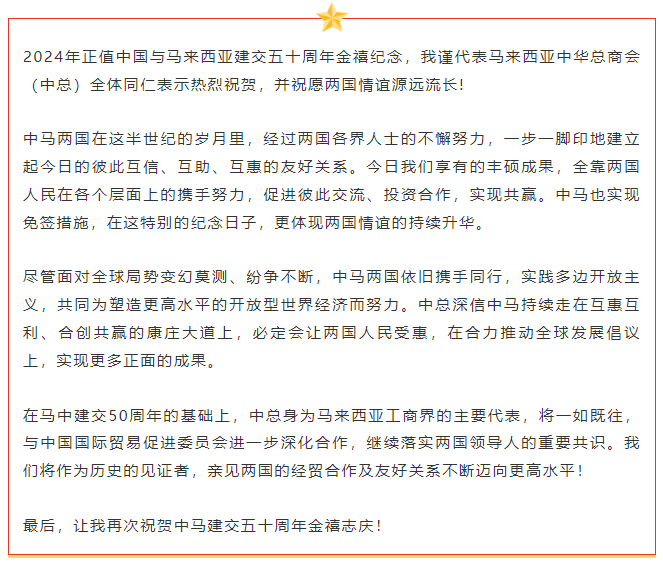 中馬建交五十周年之際,我會名譽會長、馬來西亞中華總商會總會長盧成全在《中國對外貿(mào)易雜志》發(fā)表致辭,慶賀中馬建交五十周年金禧。