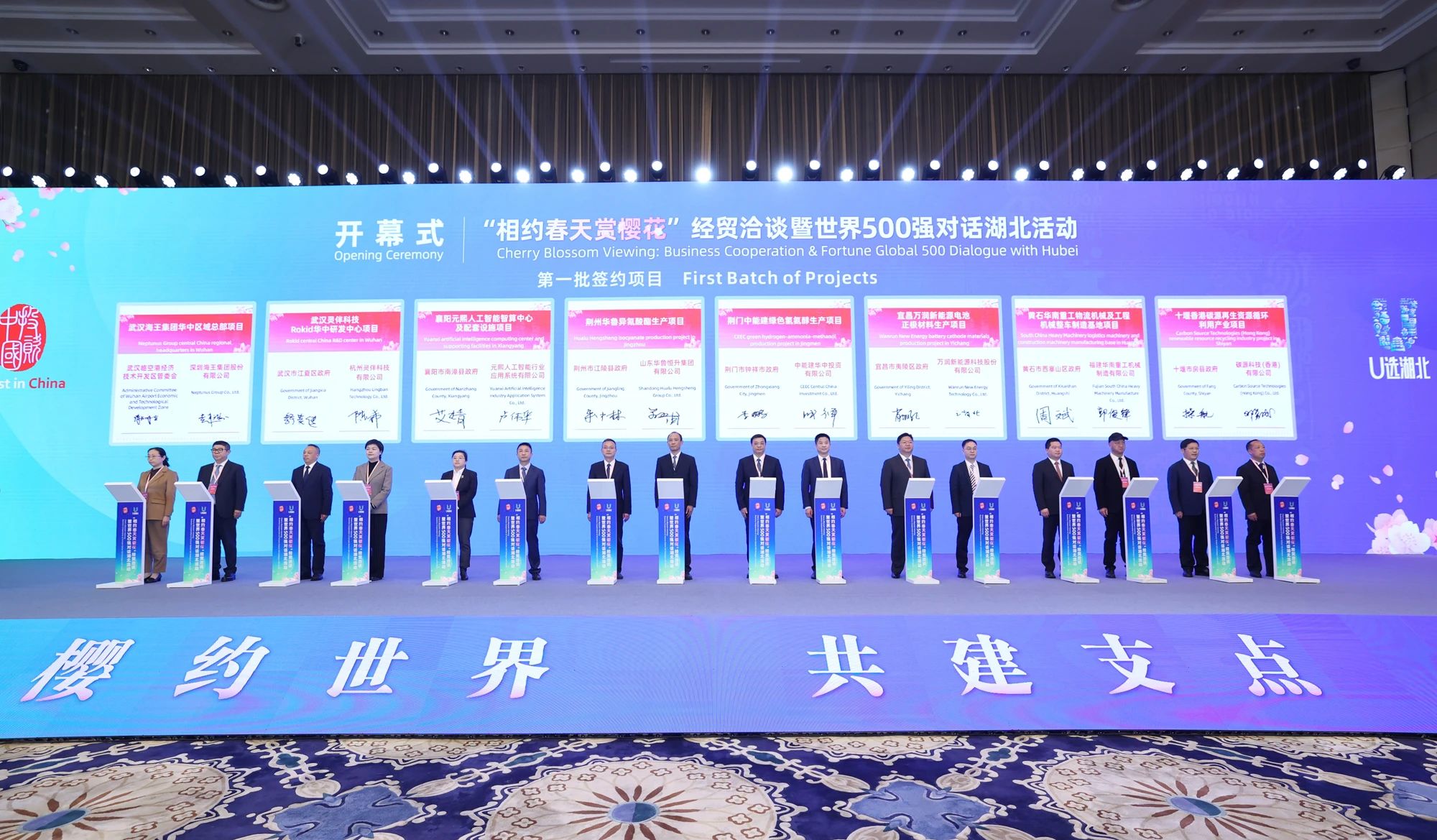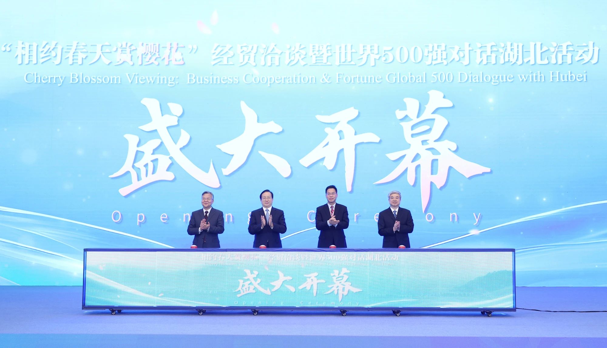 活動現(xiàn)場,王忠林、李殿勛、祁斌、唐文弘共同推桿啟動2025“相約春天賞櫻花”經(jīng)貿(mào)洽談暨世界500強(qiáng)對話湖北活動。