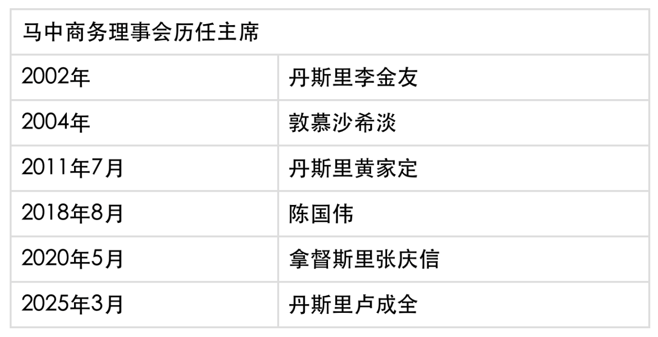 馬中商務(wù)理事會歷任主席為丹斯里李金友、敦慕沙希淡、丹斯里黃家定、陳國偉、拿督斯里張慶信和現(xiàn)任丹斯里盧成全。