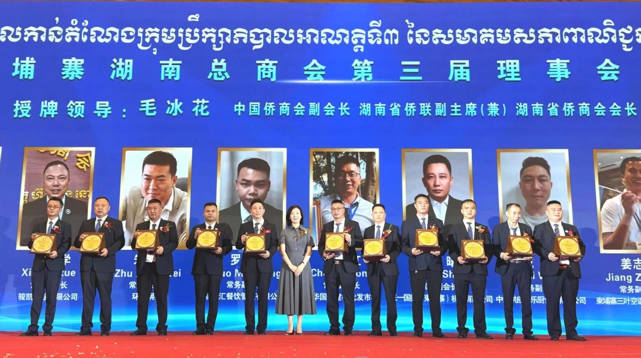 會上,大家共同見證了柬埔寨湖南總商會新老會長的會旗交接儀式,新一屆會長黎新華發(fā)表了題為“鐵肩擔(dān)起時代重任,攜手共創(chuàng)僑商偉業(yè)”的講話。毛冰花向柬埔寨湖南總商會新一屆常務(wù)副會長曹曙、李久平、陳祖紅、戴文等人頒發(fā)牌匾。
