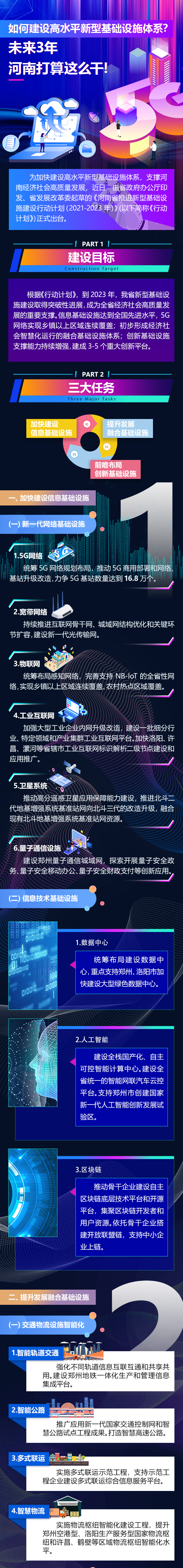 近日,由省發(fā)展改革委起草、省政府辦公廳印發(fā)的《河南省推進新型基礎(chǔ)設(shè)施建設(shè)行動計劃(2021-2023年)》(以下簡稱《行動計劃》)正式出臺。