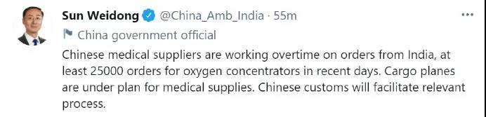 據(jù)環(huán)球網(wǎng)消息,中國(guó)駐印度大使孫衛(wèi)東發(fā)推稱,中國(guó)的醫(yī)療器械供應(yīng)商正在加班加點(diǎn)處理來自印度的訂單,最近幾天收到了至少2.5萬臺(tái)制氧機(jī)訂單。